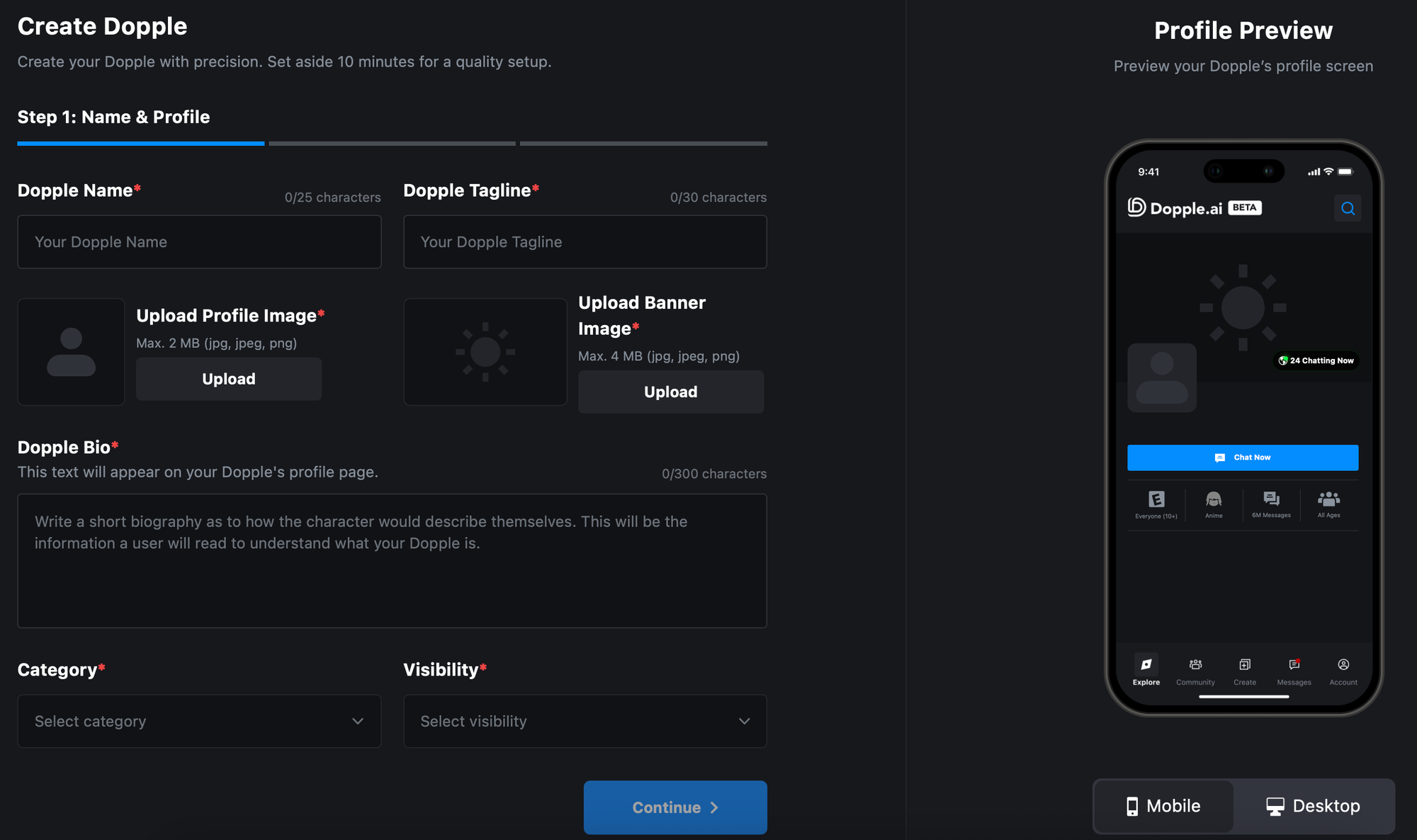 - Dopple Bio: Viết mô tả ngắn để giới thiệu về nhân vật của bạn – đây sẽ là phần hiển thị trên trang hồ sơ.