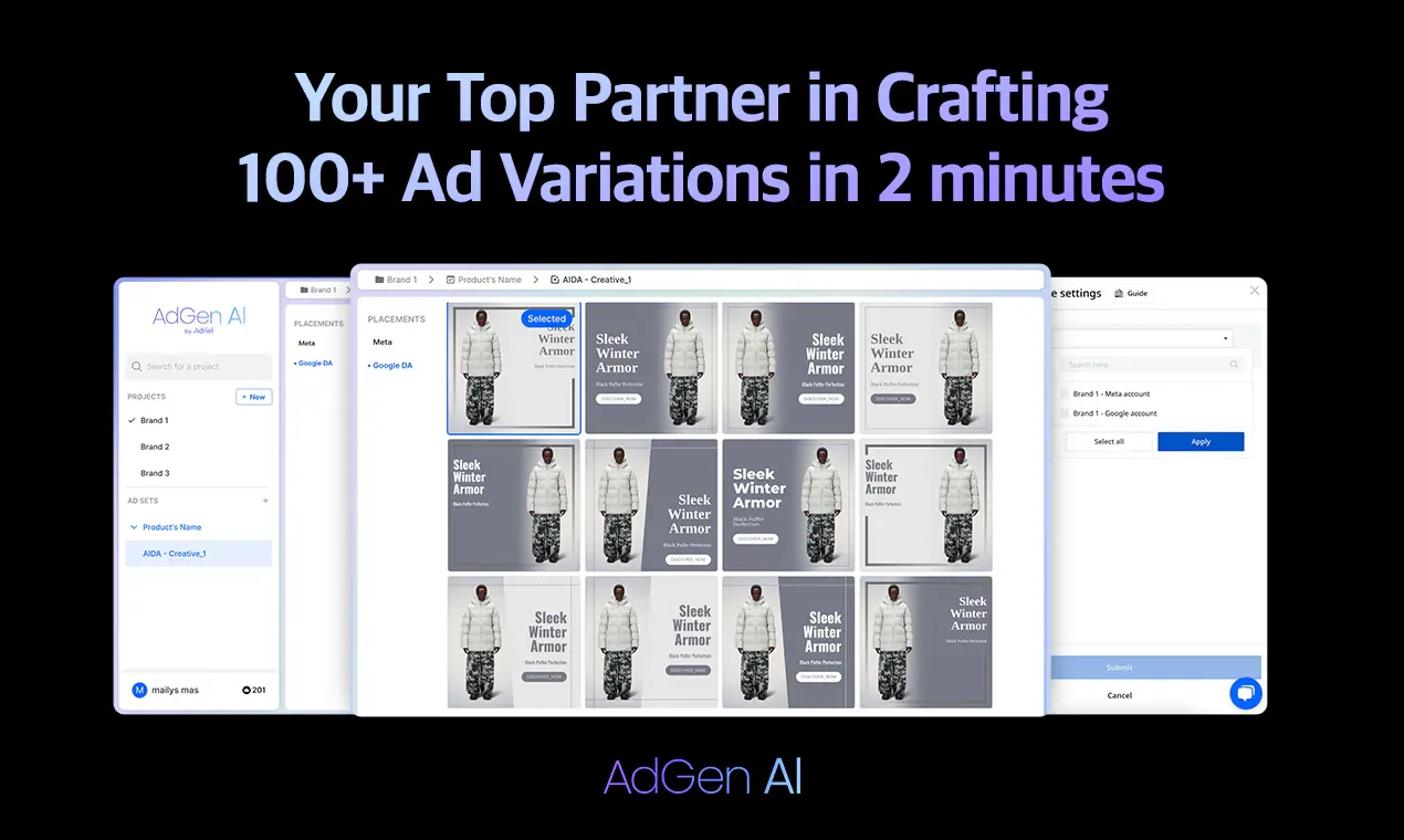 AdGen AI là nền tảng ứng dụng trí tuệ nhân tạo (AI) tiên tiến, hỗ trợ các nhà quảng cáo và doanh nghiệp tạo và phát hành quảng cáo trên nhiều kênh chỉ với một cú nhấp chuột. AdGen AI giúp bạn tiết kiệm thời gian, gia tăng hiệu quả và khai phóng sức mạnh của trí tuệ nhân tạo trong chiến dịch marketing của bạn.