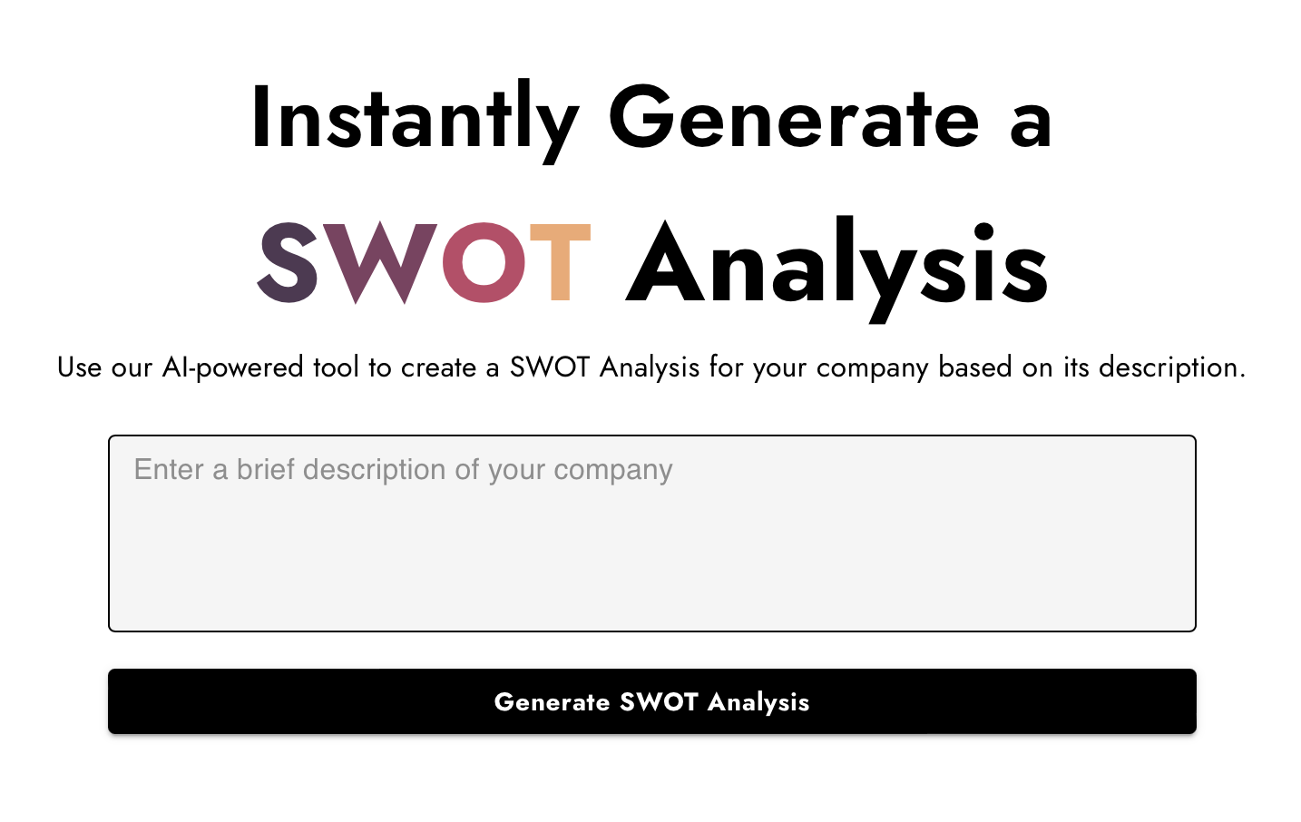 SWOT Analyzer là ứng dụng trí tuệ nhân tạo (AI) giúp bạn tạo ra phân tích SWOT nhanh chóng và chính xác. Chỉ cần cung cấp mô tả ngắn gọn về công ty của bạn, SWOT Analyzer sẽ tự động phân tích và đưa ra các yếu tố thuộc về nội tại (SW) và ngoại tại (OT) có thể ảnh hưởng đến thành công của doanh nghiệp.