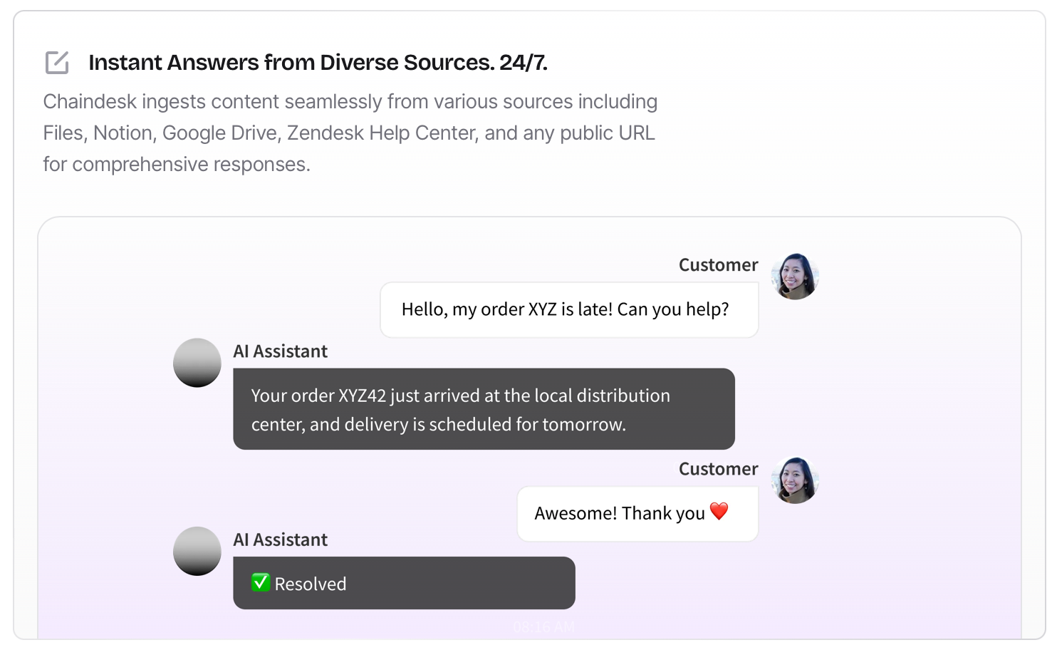Chaindesk cung cấp giải pháp AI đột phá, hỗ trợ doanh nghiệp xây dựng và đào tạo chatbot tùy chỉnh. Tích hợp sức mạnh của mô hình ngôn ngữ GPT-4 tân tiến, Chaindesk giúp doanh nghiệp tự động hóa các tác vụ hỗ trợ khách hàng, gia tăng tỷ lệ chuyển đổi khách hàng tiềm năng và tối ưu hóa hiệu quả hoạt động.