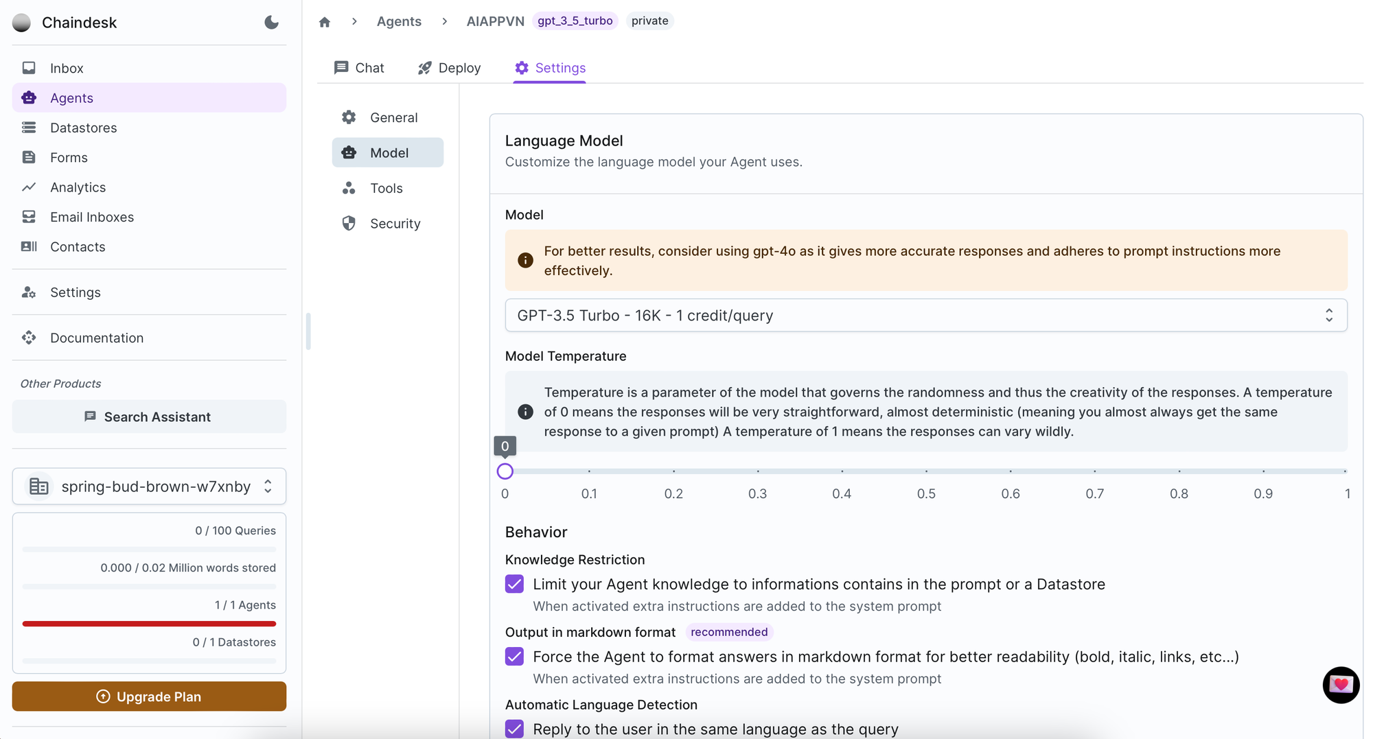 - Thiết lập các tùy chọn như "Limit your Agent knowledge," "Force the Agent to format answers in markdown format," và "Reply to the user in the same language as the query" nếu cần.