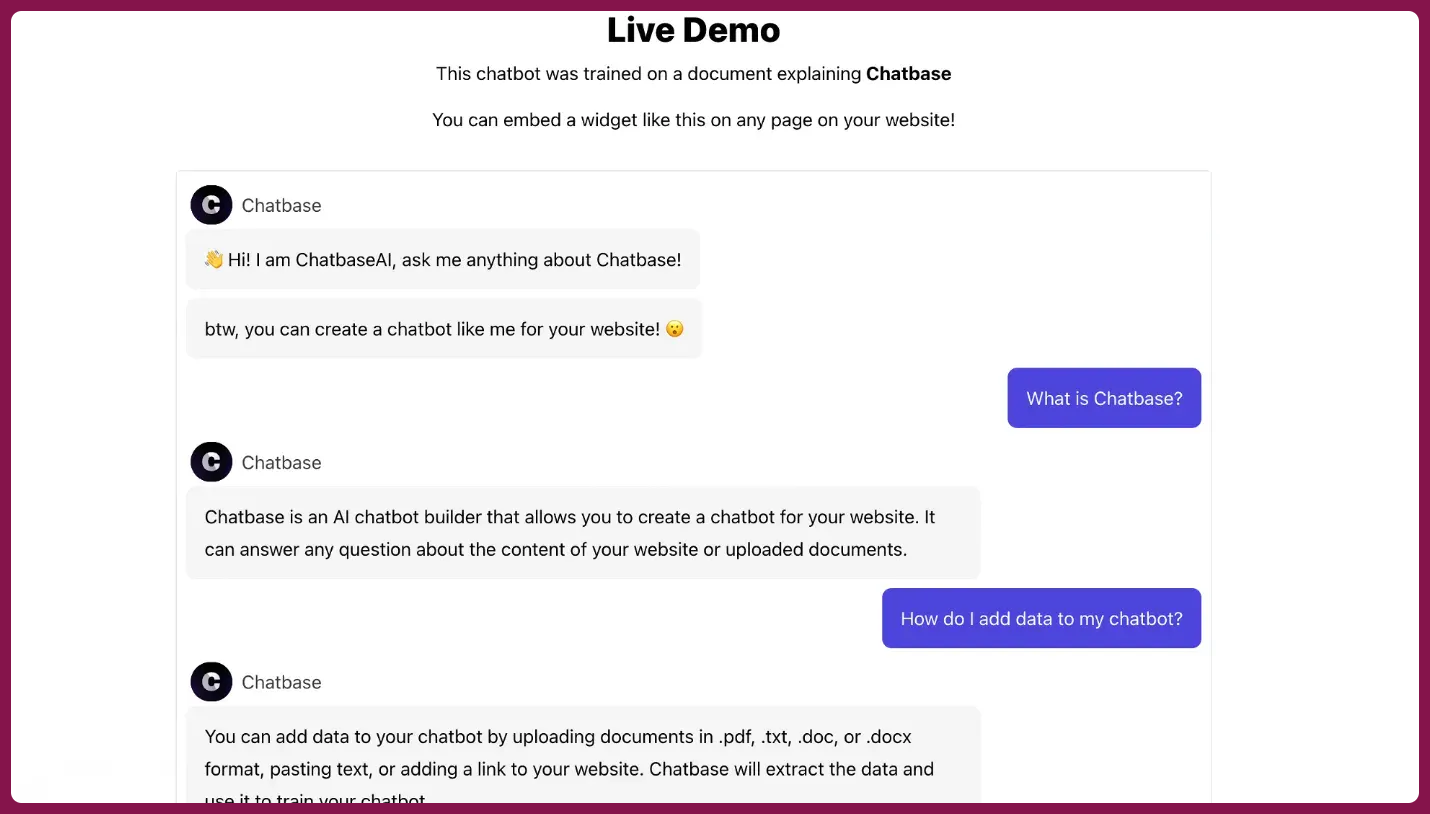 - 🤵🏼 Chăm sóc khách hàng: Chatbase có thể được sử dụng để giải quyết các vấn đề của khách hàng, cung cấp hỗ trợ kỹ thuật và trả lời các câu hỏi thường gặp.