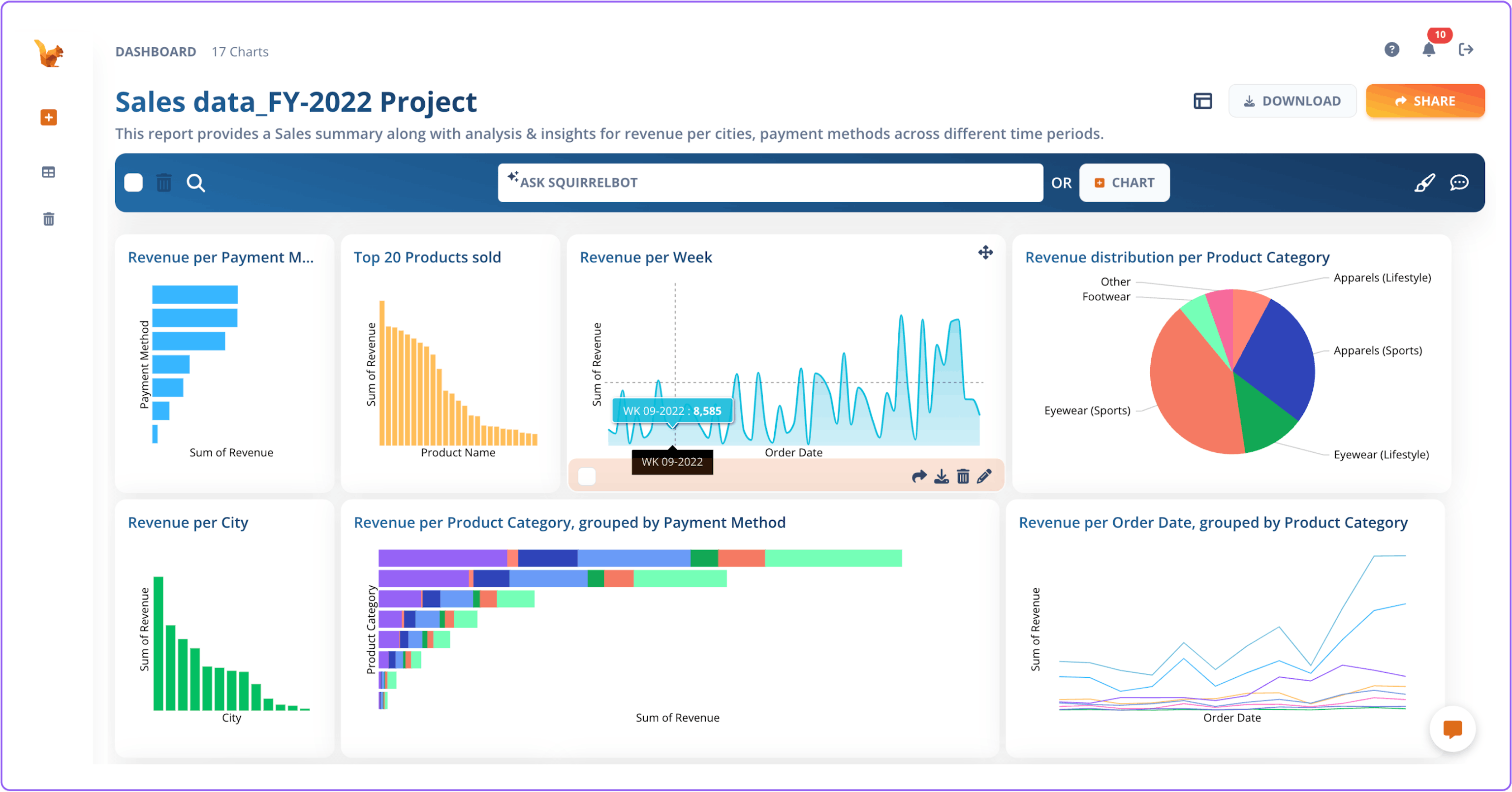 - DataSquirrel tự động xử lý: Hệ thống AI thông minh sẽ tự động làm sạch, phân tích dữ liệu và cung cấp các biểu đồ trực quan.