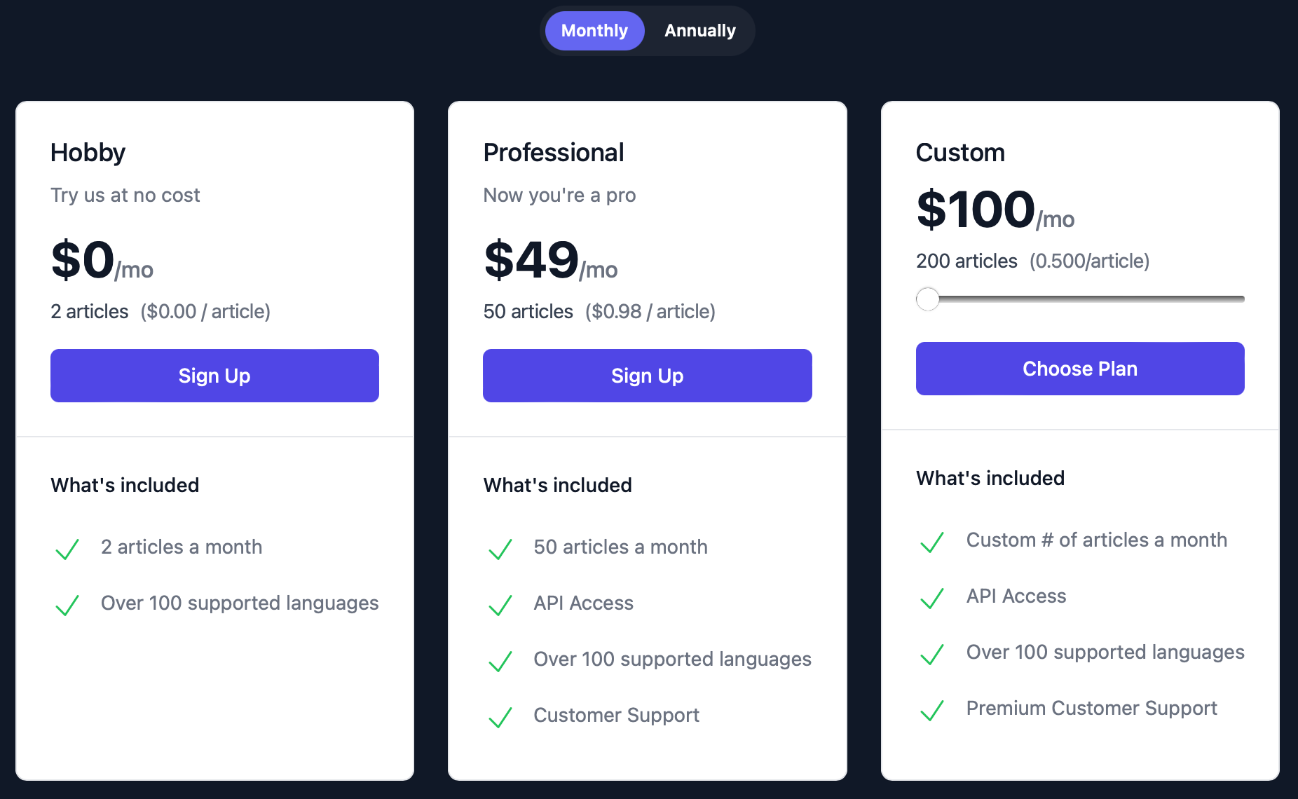 Drafthorse AI cung cấp các gói cước linh hoạt với mức giá hợp lý, đáp ứng nhu cầu của cá nhân, doanh nghiệp và tổ chức. Bạn có thể hủy bỏ dịch vụ bất kỳ lúc nào và được hoàn tiền 100%.