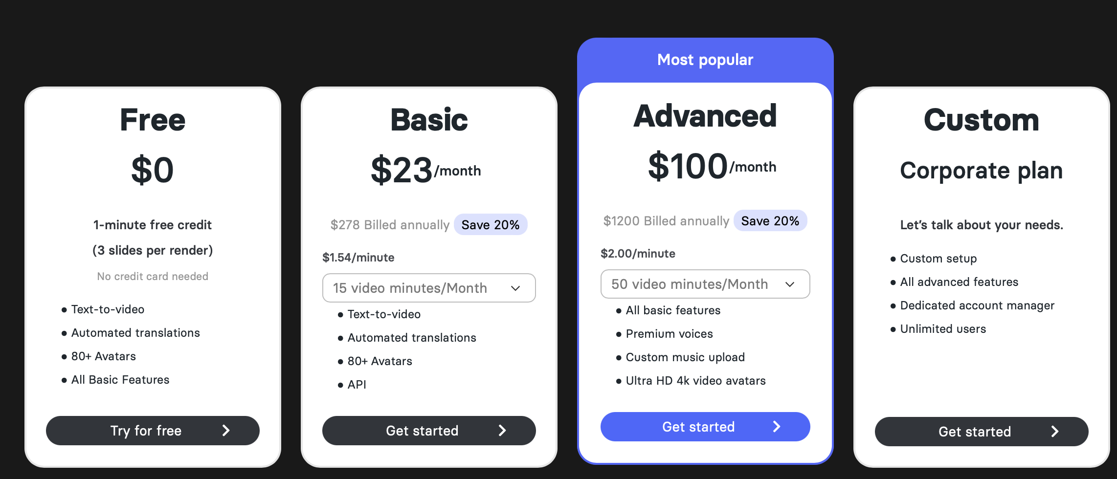 Elai cung cấp nhiều gói cước với mức giá cạnh tranh nhất trên thị trường, bắt đầu từ 23$/tháng cho 15 phút tạo video.