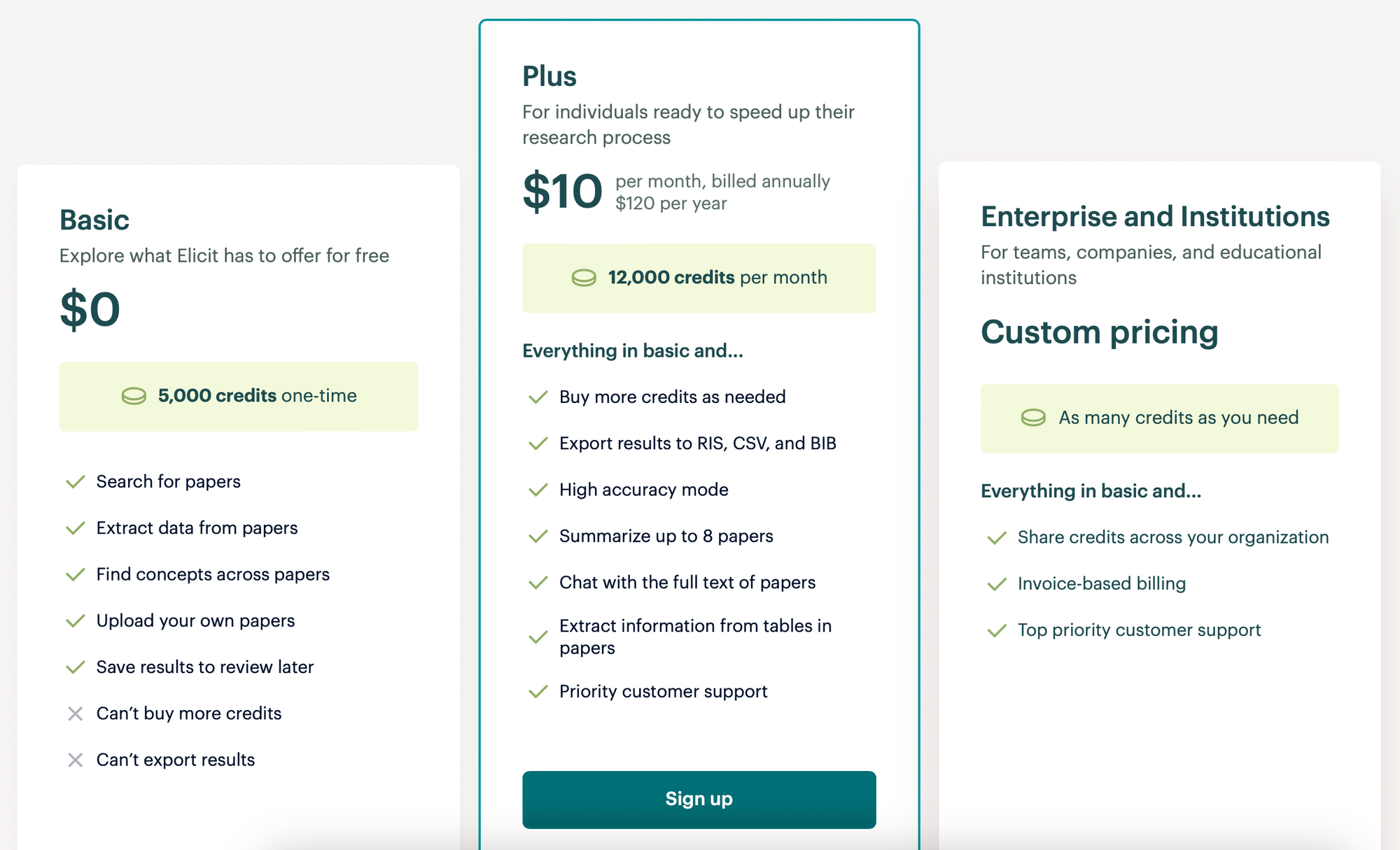 - Plus (10 USD/tháng hoặc 120 USD/năm): Tất cả các tính năng của gói Basic, cộng thêm mua thêm tín dụng khi cần, xuất kết quả sang RIS, CSV và BIB, chế độ độ chính xác cao, tóm tắt tối đa 8 bài báo, trò chuyện với toàn văn của bài báo, trích xuất thông tin từ bảng trong bài báo, hỗ trợ khách hàng ưu tiên.