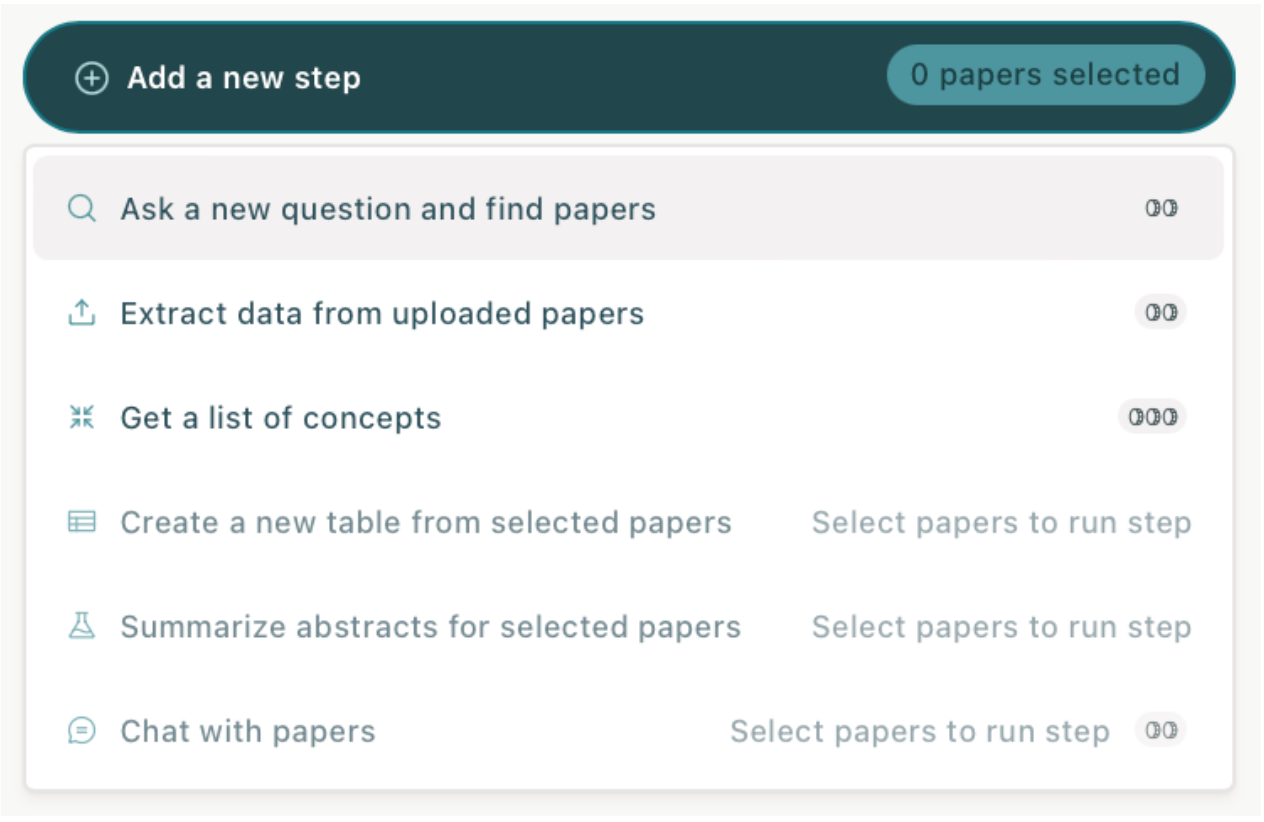 - Nhấn "Create a new table from selected papers" trong menu "Add a New Step".