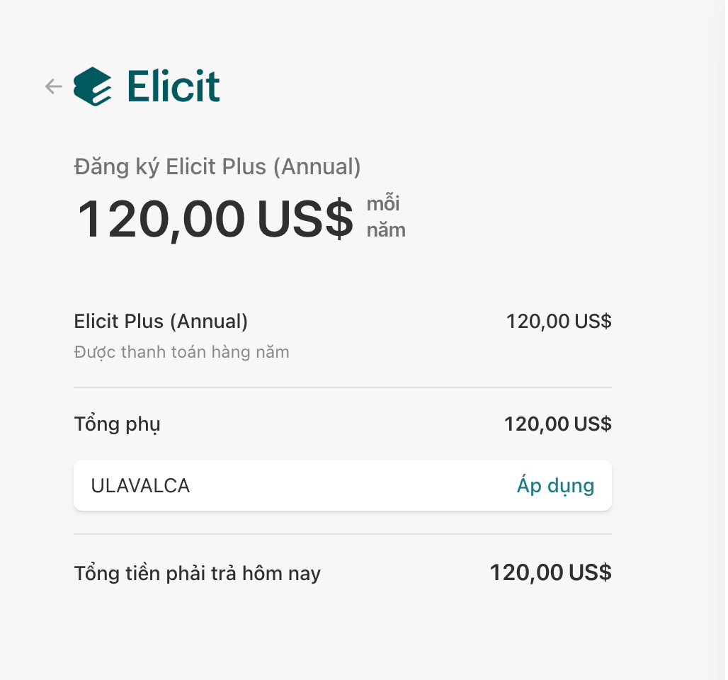 Để sử dụng Elicit Pro miễn phí trong 1 năm, truy cập vào phần Pricing sau đó chọn gói Elicit Pro. Ở phần thanh toán, bạn nhập mã "ULAVALCA" để sử dụng bản Pro miễn phí trong 1 năm.