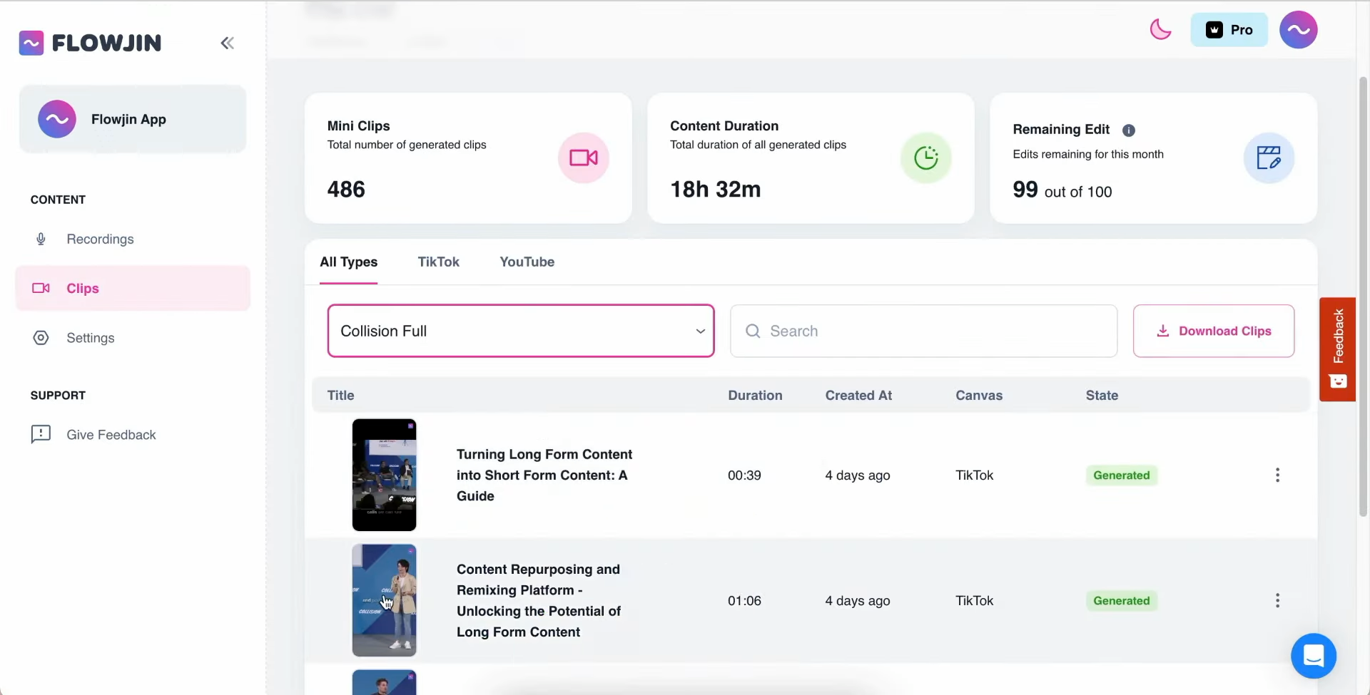 Khi bạn đã hài lòng với chỉnh sửa, hãy nhấp vào nút "Generate Clip" để tạo tệp video có thể tải xuống. FlowJin cung cấp các tùy chọn tùy chỉnh cho clip đã tạo, chẳng hạn như kích thước khung hình và nền.