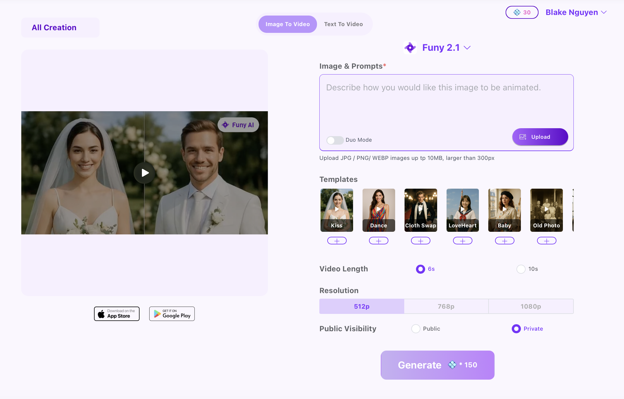 Tự động tạo video hôn, ôm, hoặc tương tác tình cảm từ ảnh chân dung. Hoàn hảo để tặng người yêu, làm video kỷ niệm, hoặc tạo nội dung mạng xã hội viral.