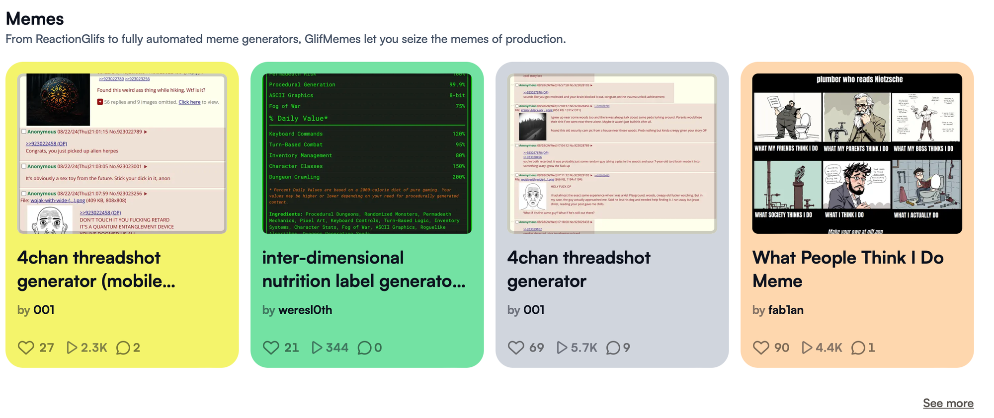 Khám phá thư viện meme phong phú và tùy chỉnh các mẫu meme để tạo ra nội dung hài hước và chia sẻ trên mạng xã hội. Glifs cung cấp nhiều mẫu meme với các tùy chọn chỉnh sửa dễ sử dụng để giúp bạn tạo ra những meme nổi bật và gây ấn tượng. 😂