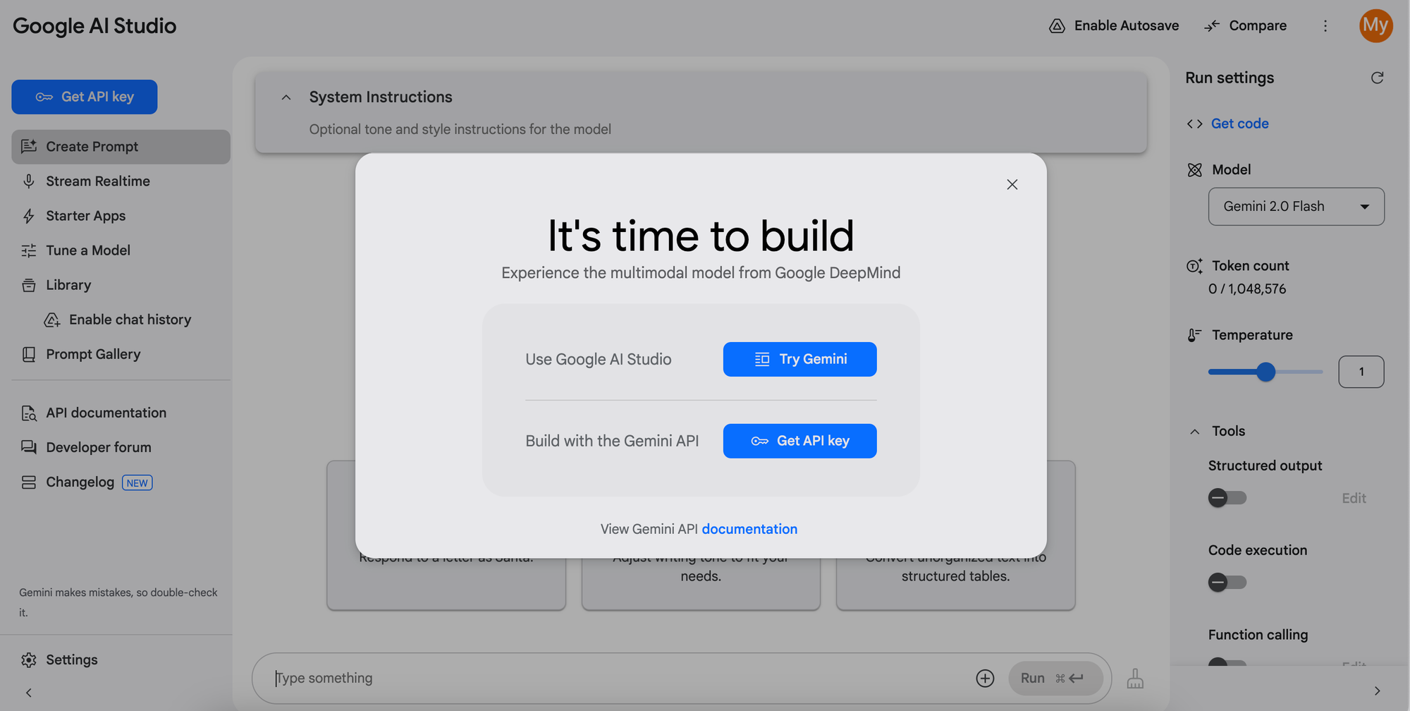 Giao diện thân thiện của AI Studio cho phép bạn tạo lời nhắc nhanh chóng. Dùng chế độ trò chuyện để "nói chuyện" với AI hoặc chế độ cấu trúc để tùy chỉnh đầu ra theo ý thích – không cần biết code cũng làm được! 😎