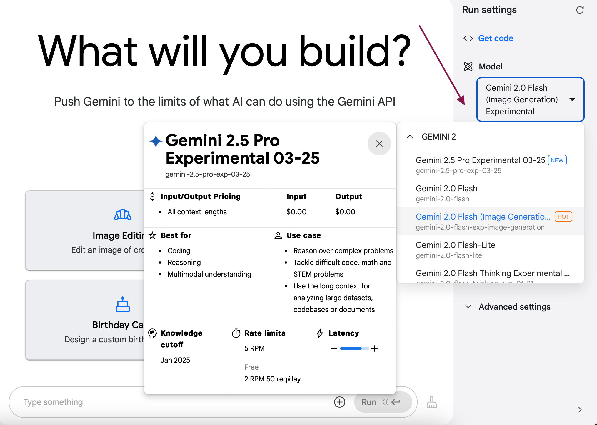 Với Google AI Studio, bạn có thể dùng ngay các phiên bản của Gemini Google như Gemini 1.0 Pro hay Gemini 1.5 Flash. Đây là những "siêu AI" đa năng, sẵn sàng giúp bạn giải quyết mọi tác vụ từ viết code đến phân tích hình ảnh 🎉.