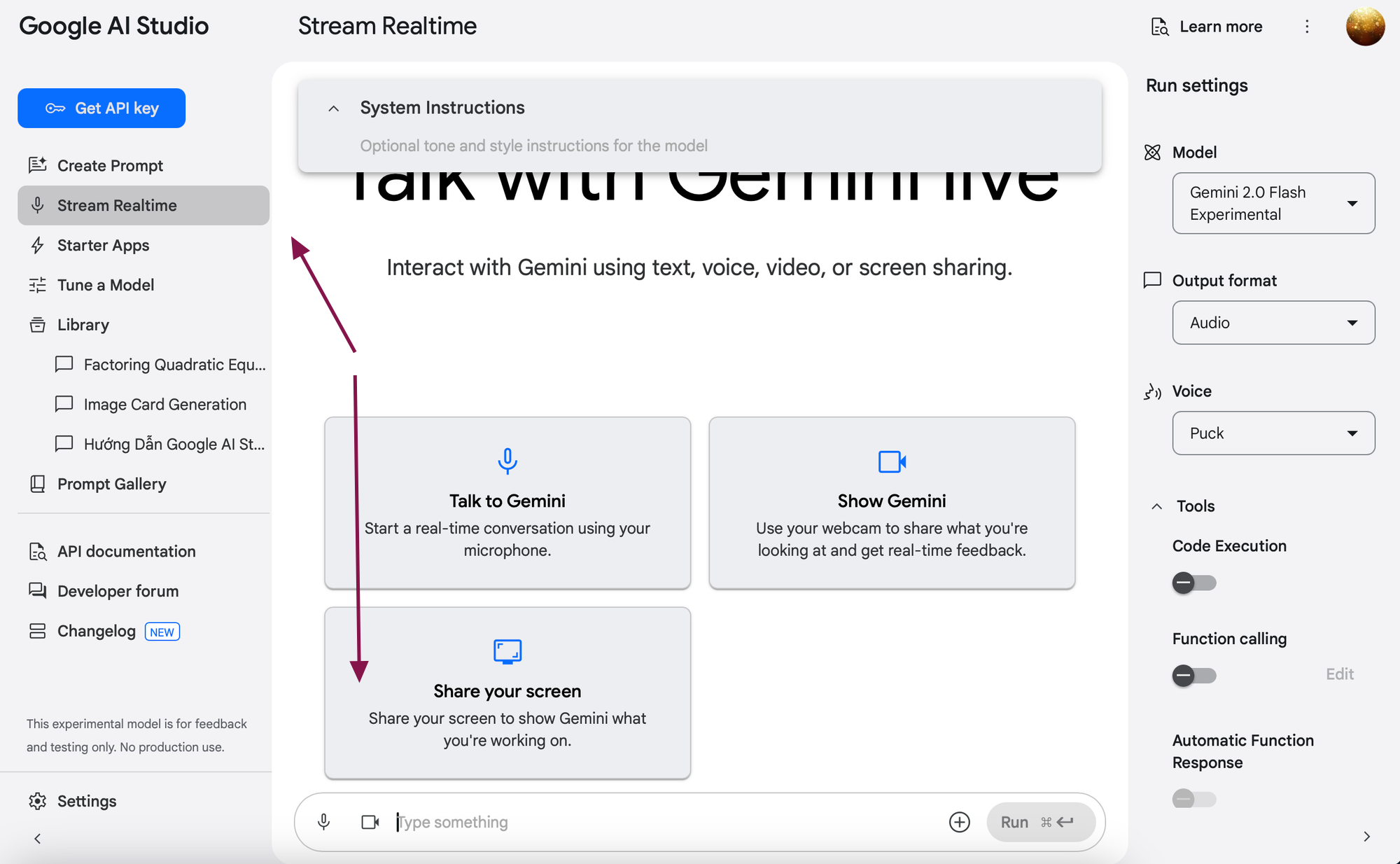 Tính năng Stream Realtime mới toanh của Google AI Studio cho phép bạn chia sẻ màn hình và nhận hướng dẫn trực tiếp từ AI. Học cách dùng phần mềm hay debug code theo thời gian thực? Quá đơn giản! ⏱️