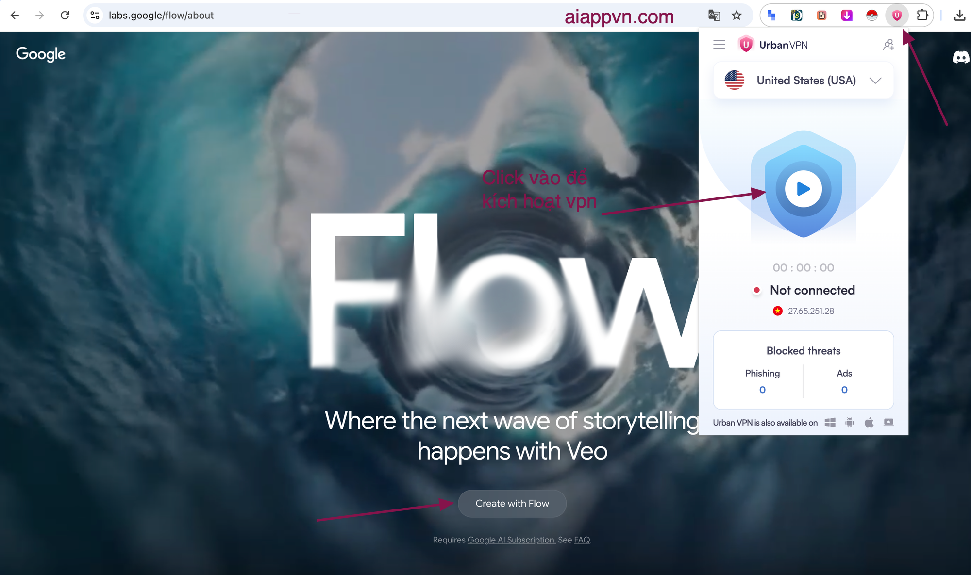 Để sử dụng tính năng "Tạo video từ hình ảnh có giọng nói" trên Veo 3, bạn cần truy cập vào giao diện Flow của Google và đổi địa chỉ IP sang quốc gia được hỗ trợ (như Hoa Kỳ). Cách thực hiện như sau: