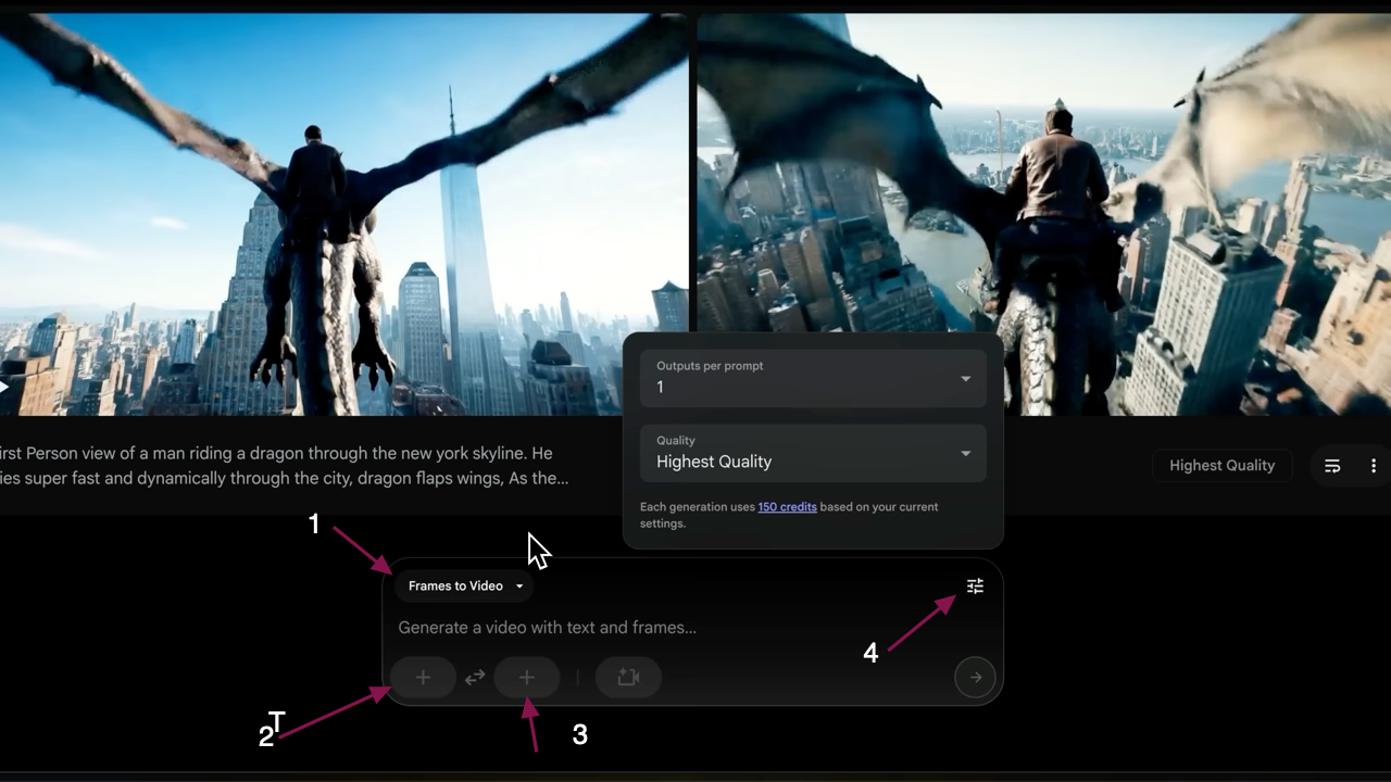 - Upload ảnh hoặc tạo ảnh đầu và ảnh cuối bằng cách click vào dấu "+". Nếu ảnh được tạo ra bằng Prompt (sau khi click vào dấu +) bạn cũng có thể cài đặt số lượng và chất lượng ảnh mà bạn muốn AI tạo ra phù hợp tránh lãng phí Credit.