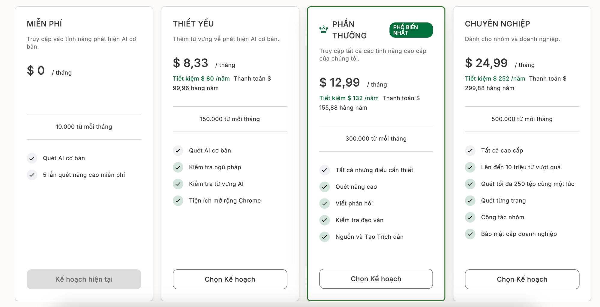 - Miễn phí: Giới hạn quét, không có kiểm tra đạo văn.