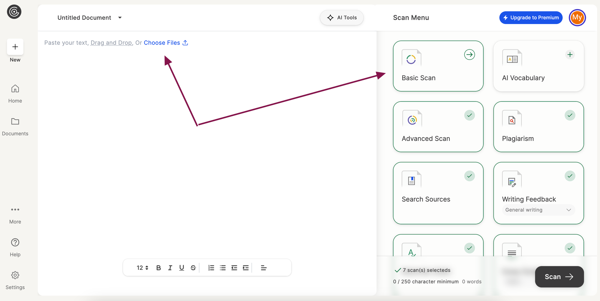 - Menu quét: Basic Scan, Advanced Scan, Plagiarism, v.v.