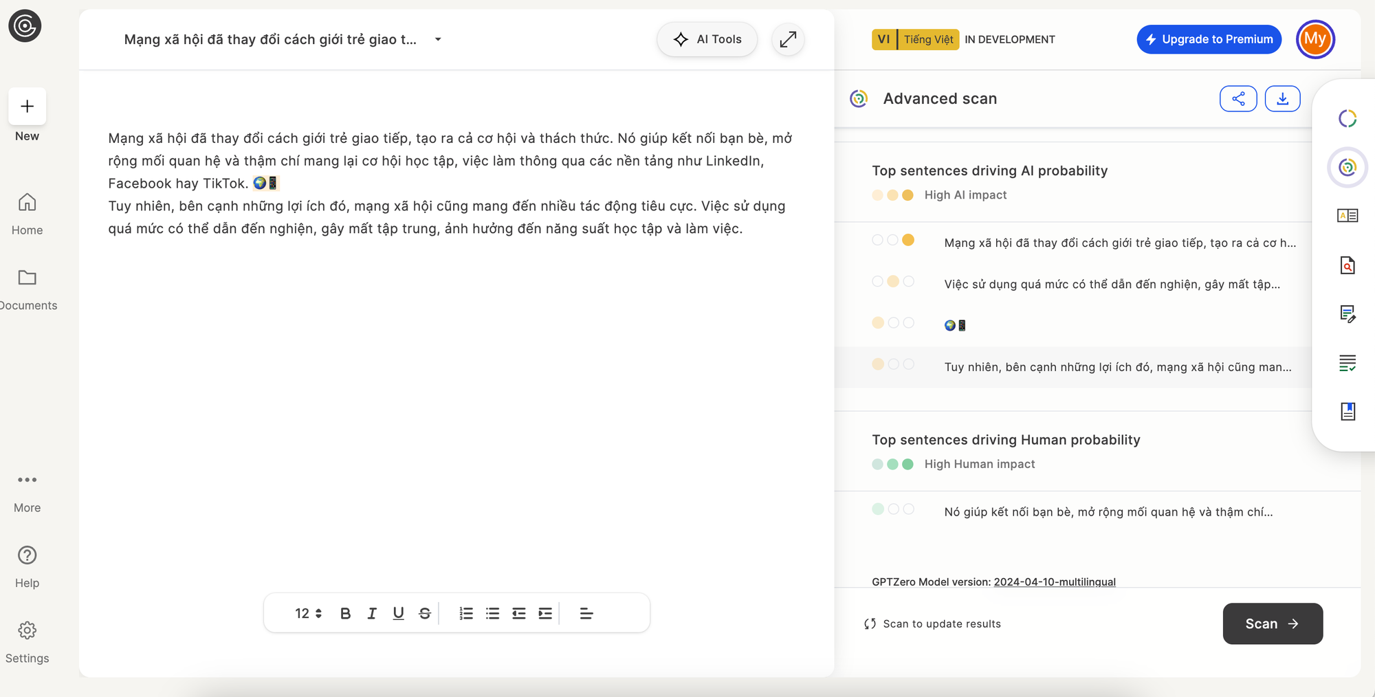 - Advanced Scan: Phân tích chi tiết từng câu (khuyến nghị cho độ chính xác cao) 🔍.