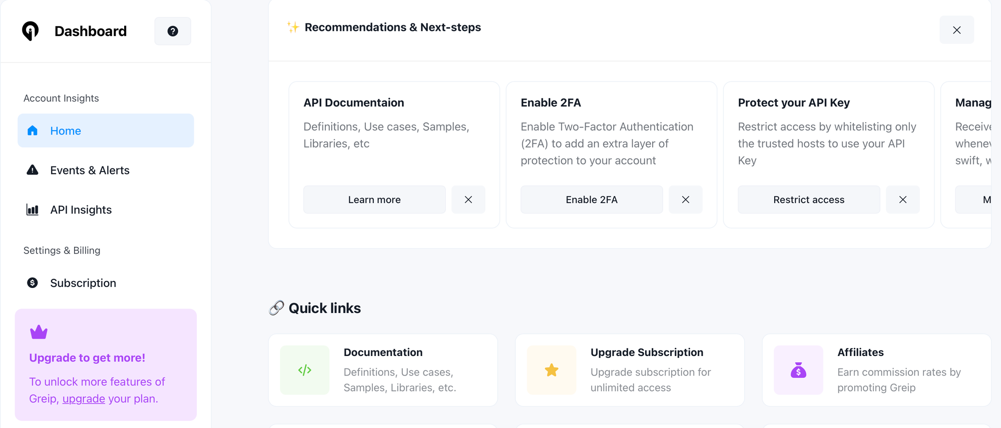 Để mở khóa thêm tính năng, bạn có thể nâng cấp gói đăng ký của mình. Greip cung cấp nhiều gói khác nhau phù hợp với nhu cầu của bạn.