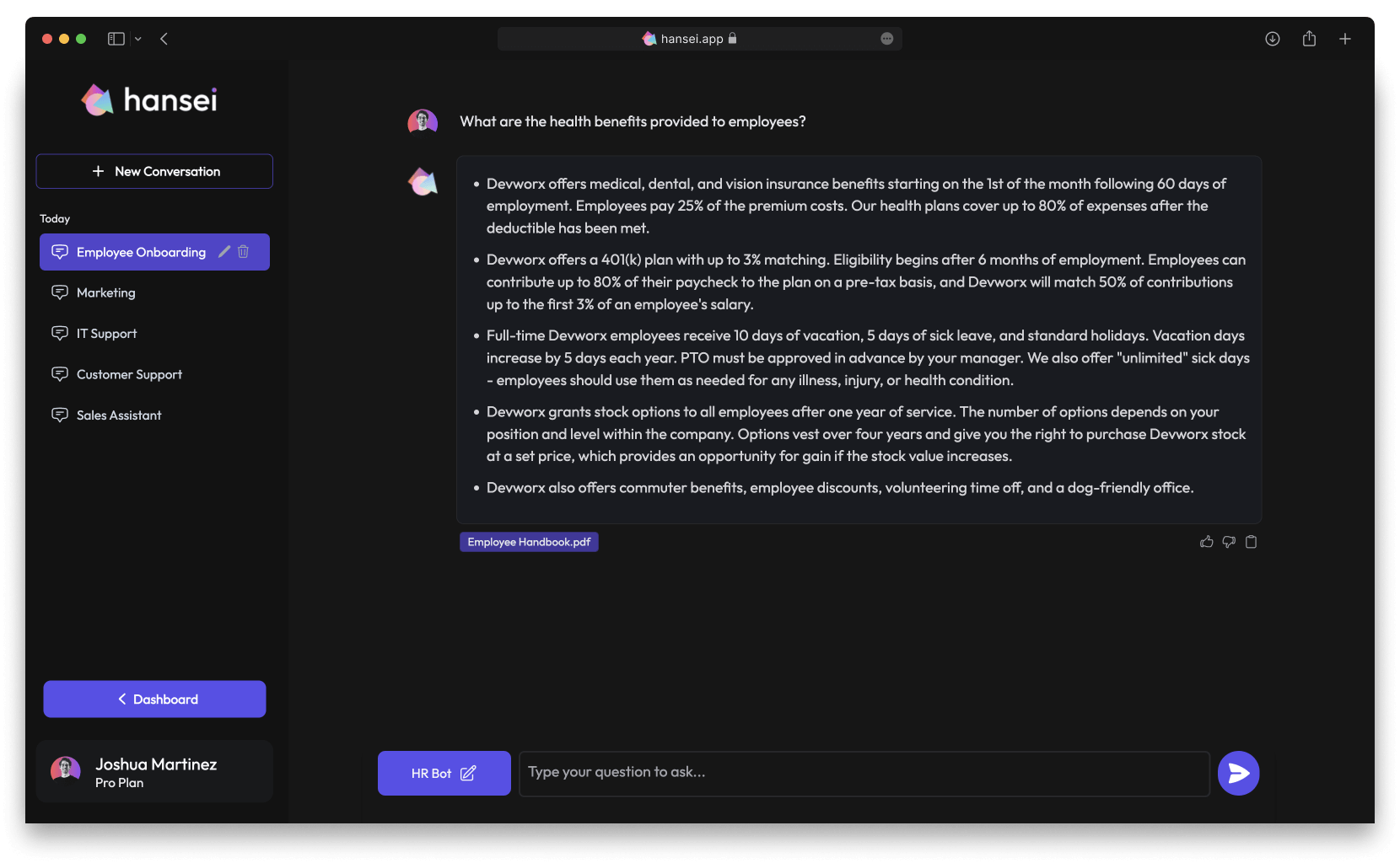 - Tích hợp Trên Nhiều Nền Tảng: Trò chuyện với chatbot của Hansei trên các nền tảng quen thuộc như Slack, Teams và hơn thế nữa (một số tích hợp đang trong giai đoạn phát triển).
