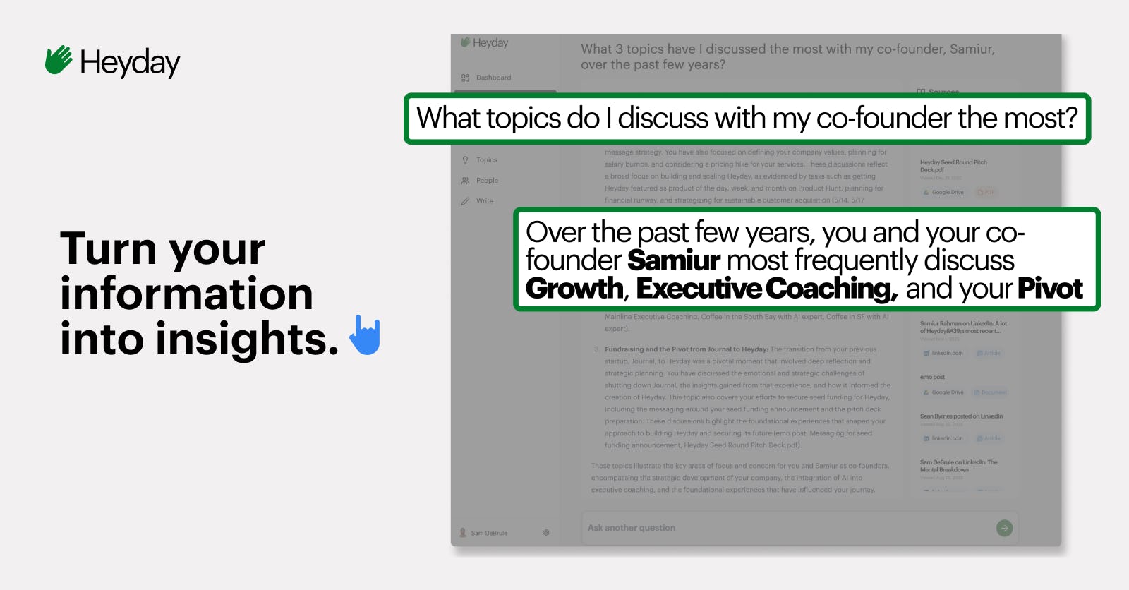 Heyday ra đời như một trợ lý AI đắc lực, giúp bạn giải quyết vấn đề quá tải thông tin. Heyday trích xuất những nội dung cốt yếu từ email, tài liệu, ghi chú, cuộc trò chuyện và bài viết, biến chúng thành kho lưu trữ thông tin đồ sộ, dễ dàng tìm kiếm.