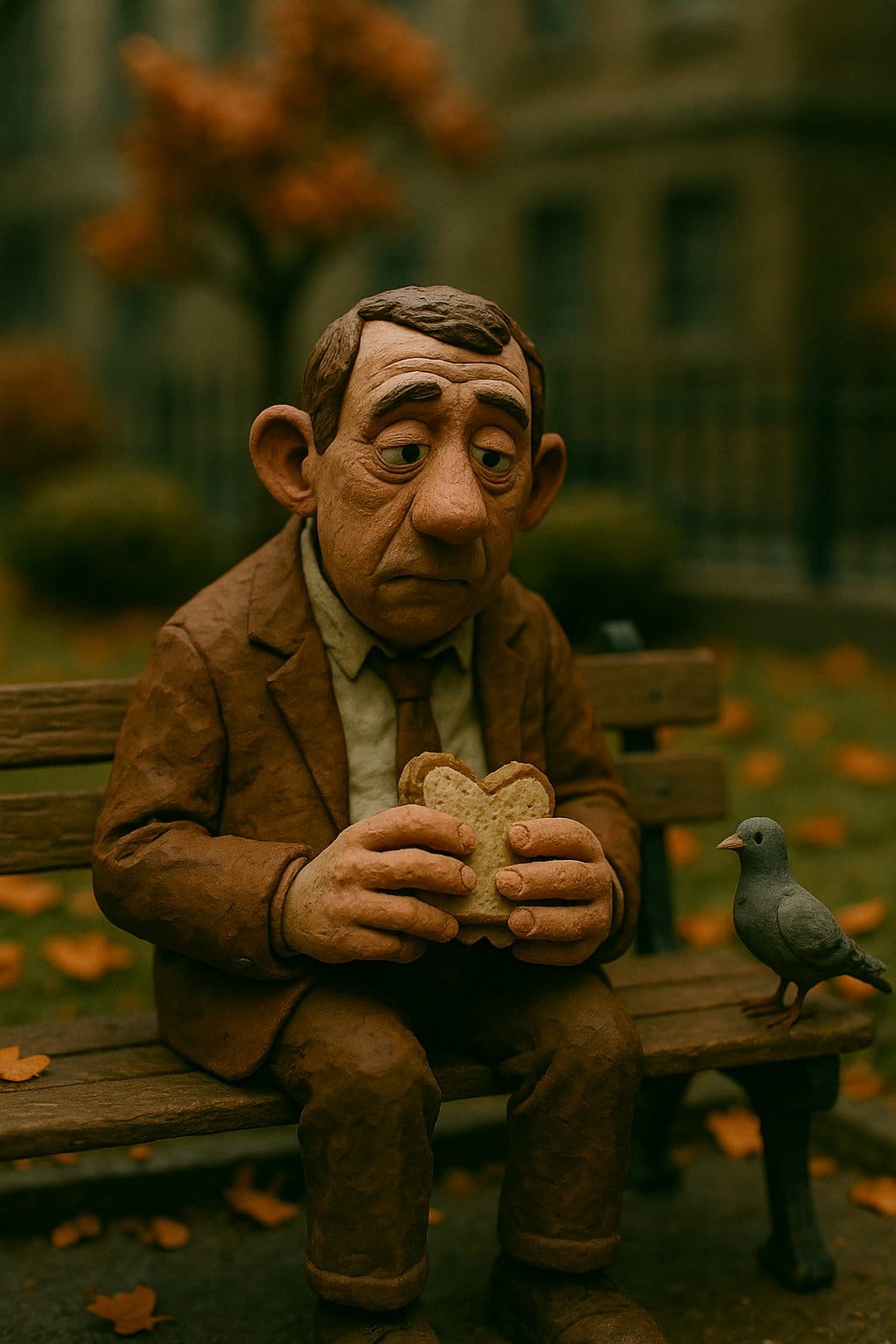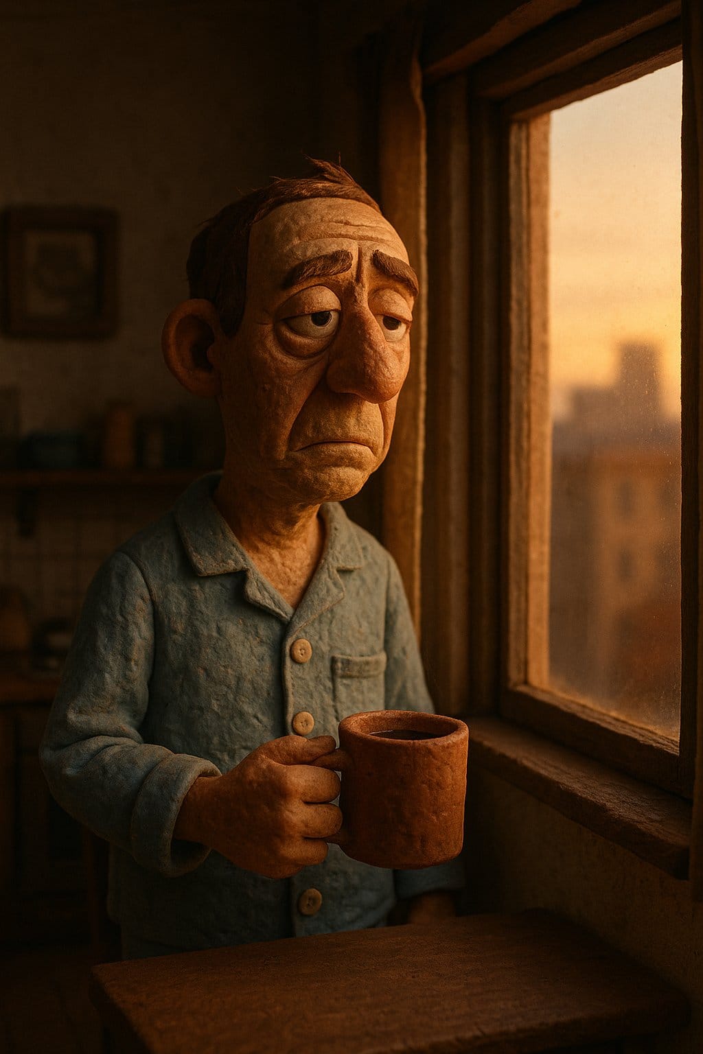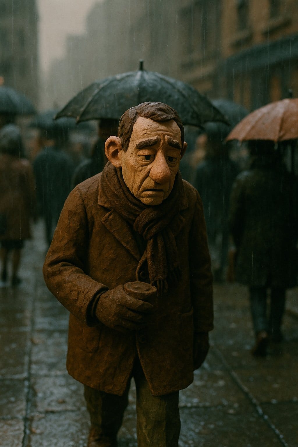 "Cinematic claymation scene, [character] made of detailed modeling clay, visible fingerprints and handcrafted textures, [action], set in [location / environment], miniature hand-built set, photorealistic lighting with soft practical shadows, atmospheric depth, shallow depth of field, filmed with a 35mm lens, rich clay color palette, realistic stop-motion aesthetic, animation frame still, professional film lighting, cinematic composition."