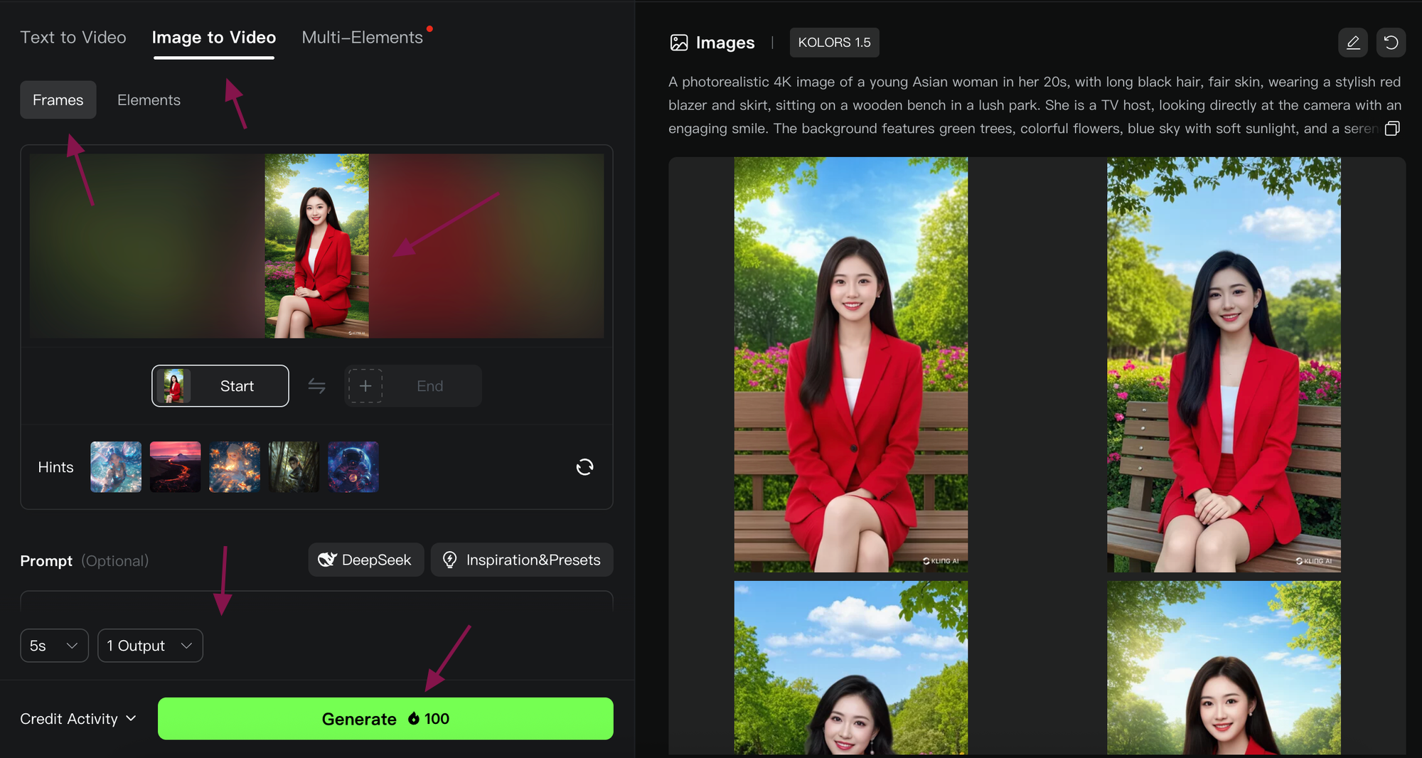 - Chọn tab "AI Video" → "Image to video" → "Frames"