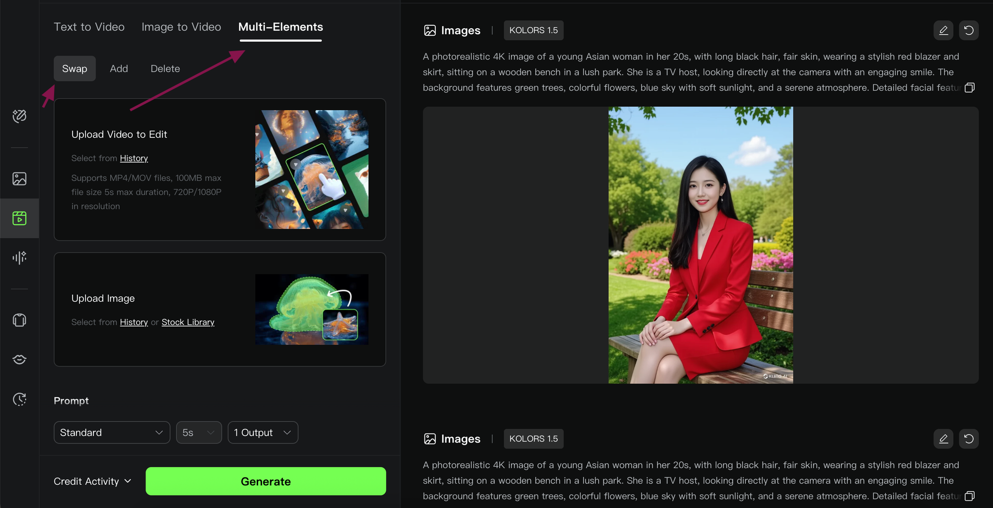 - Chọn Video Generation → Chuyển sang tab Multi Elements và chọn chế độ Swap. Bạn cũng có thể chọn "Add" hoặc "Delete" để thêm hoặc đối tượng vật thể tương ứng cho video