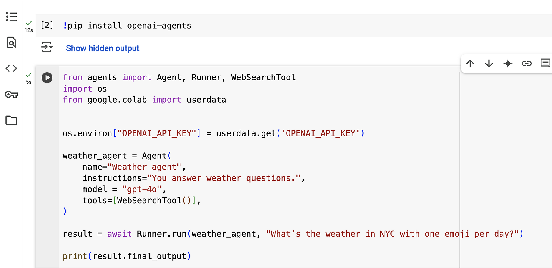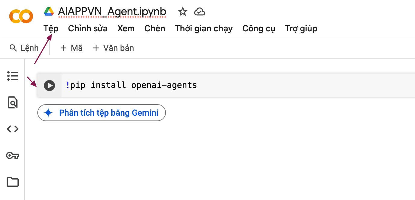 !pip install openai-agents --force - Khởi động lại runtime: Chọn Runtime > Restart runtime