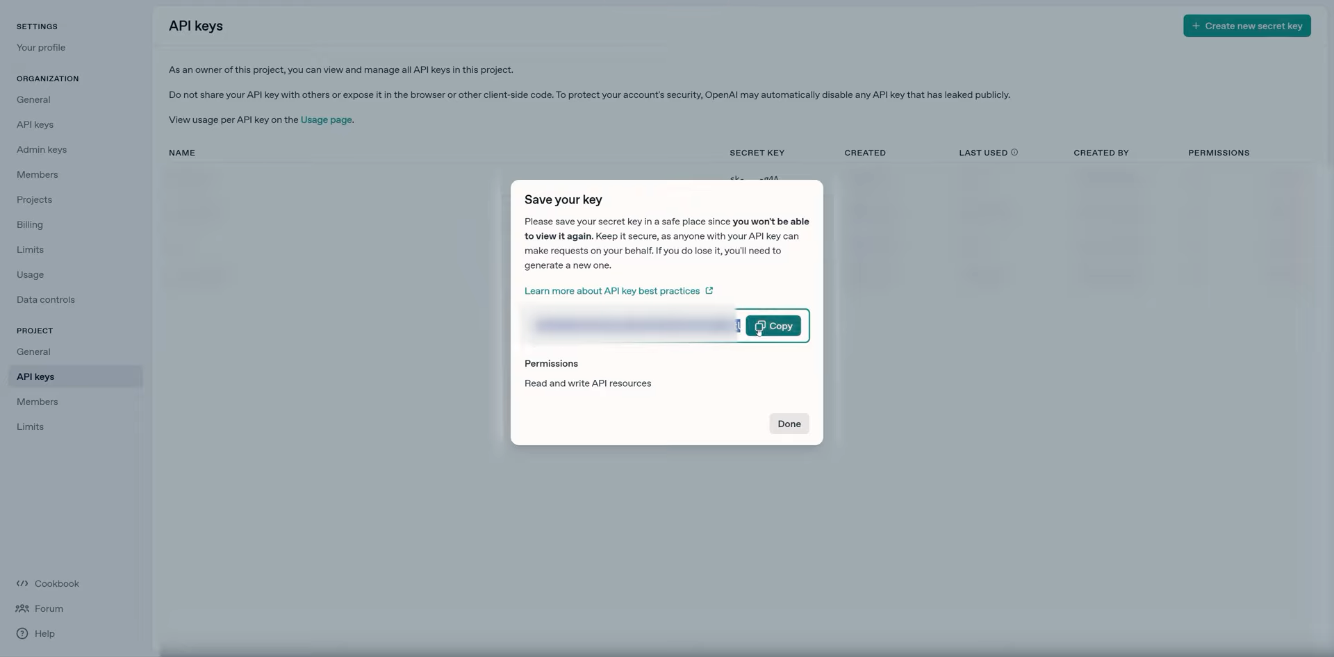 Lưu ý bảo mật: Tuyệt đối không chia sẻ API key của bạn công khai (như trong GitHub, blog, hoặc mạng xã hội). Nó giống như mật khẩu ngân hàng cho tài khoản OpenAI của bạn!