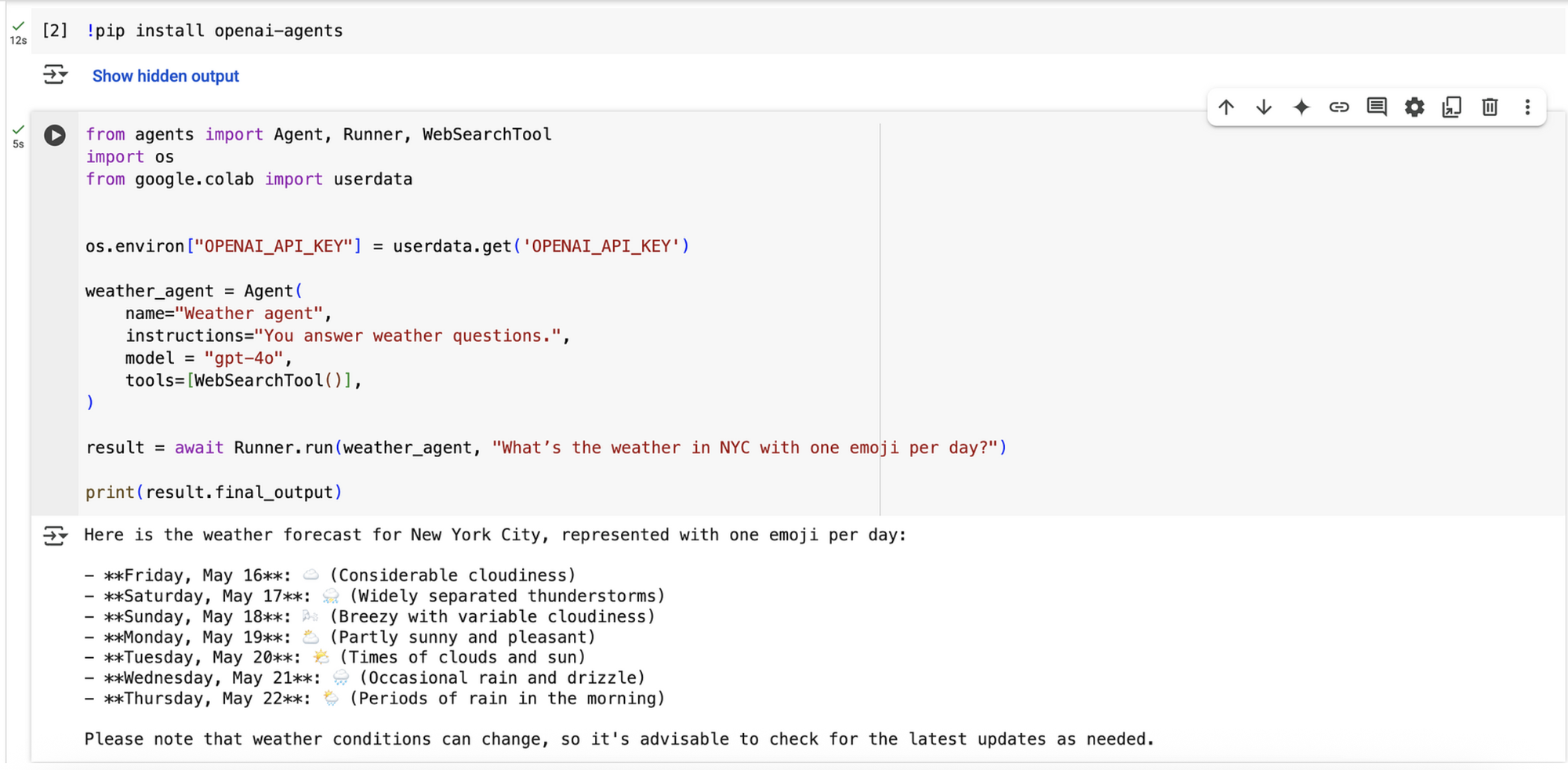Bằng cách làm theo hướng dẫn này, bạn đã tạo thành công một trợ lý AI cá nhân có thể tìm kiếm và cung cấp thông tin thời tiết cập nhật. Đây chỉ là bước đầu tiên - với nền tảng này, bạn có thể mở rộng và tùy chỉnh agent của mình để làm nhiều nhiệm vụ phức tạp hơn, từ phân tích dữ liệu đến tự động hóa công việc hàng ngày!