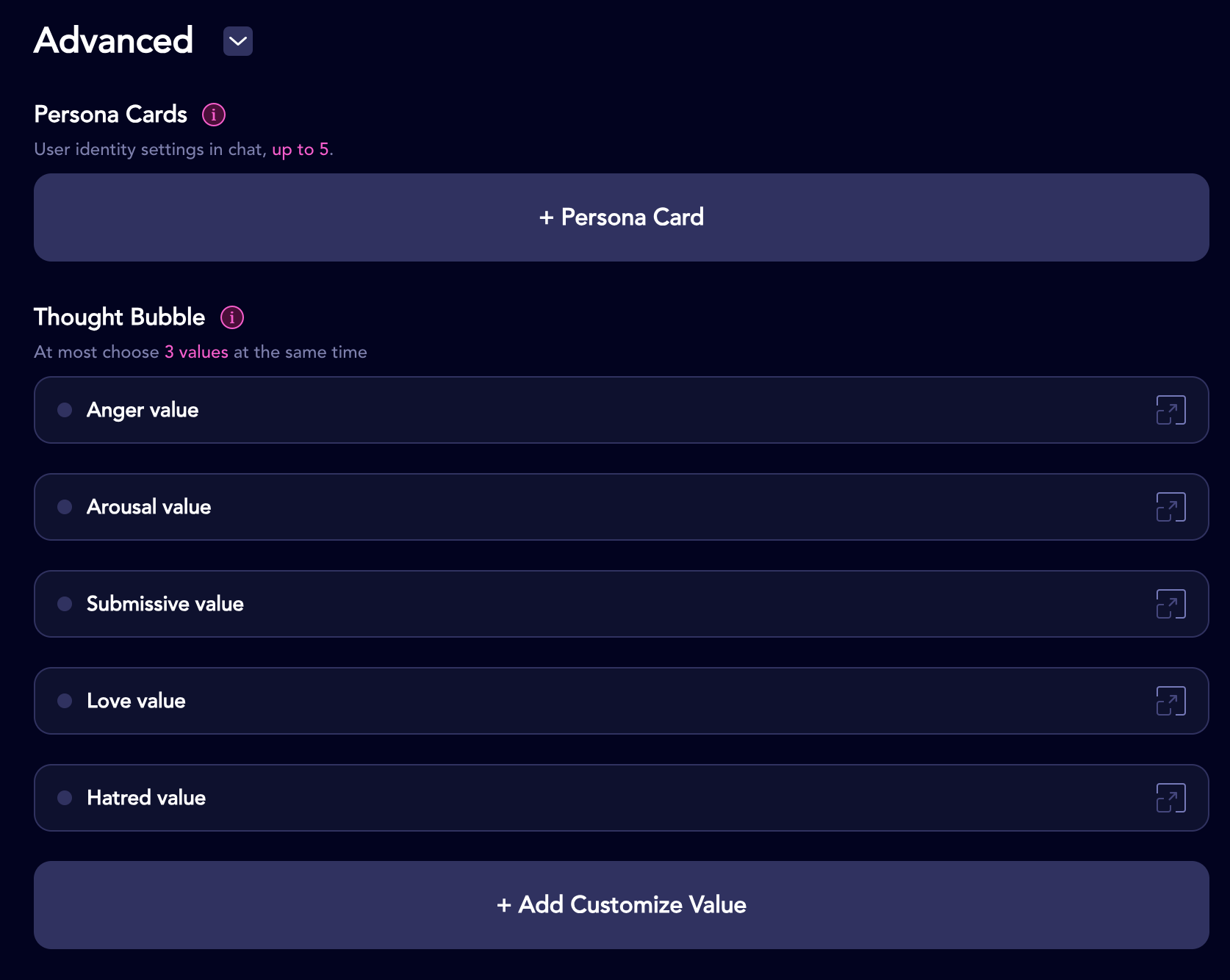 JuicyChat cho phép bạn điều chỉnh tối đa 3 giá trị cảm xúc cùng một lúc: