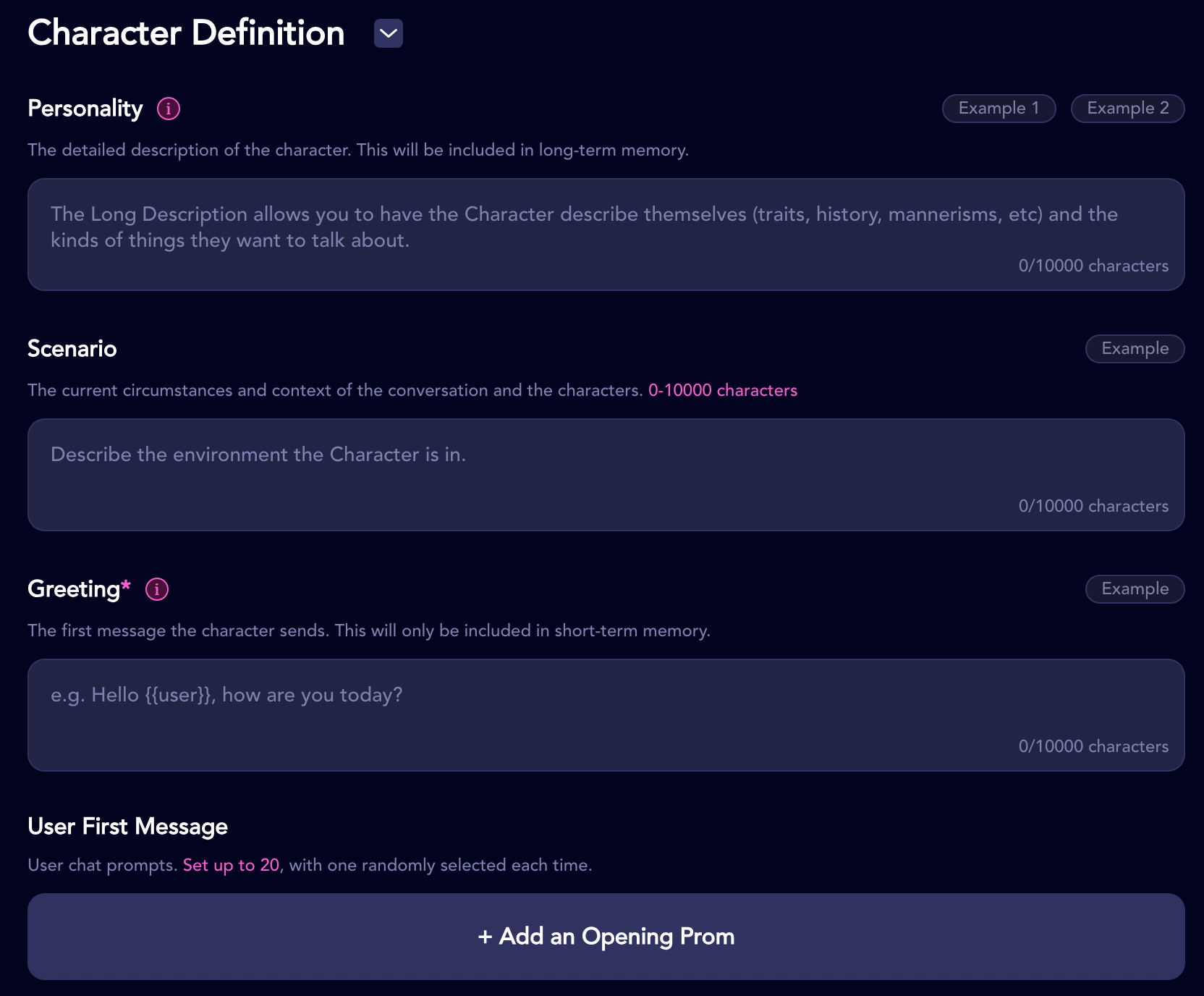 - Đây là tin nhắn đầu tiên nhân vật gửi khi bắt đầu cuộc trò chuyện (tối đa 10,000 ký tự)