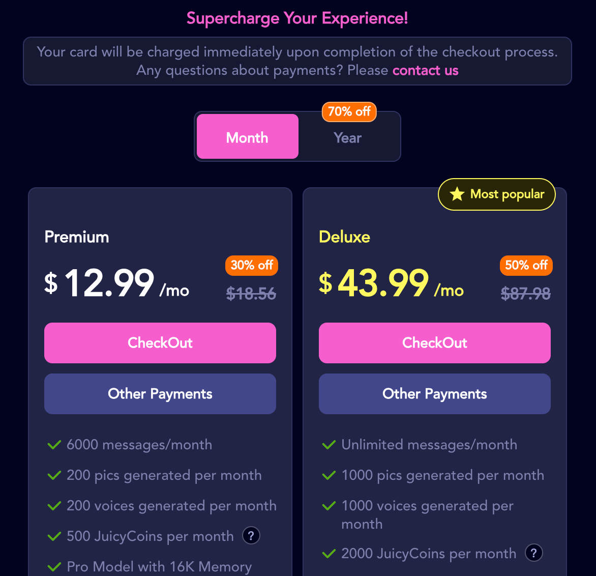 JuicyChat AI hoạt động trên mô hình freemium, cung cấp cả tùy chọn miễn phí và trả phí: