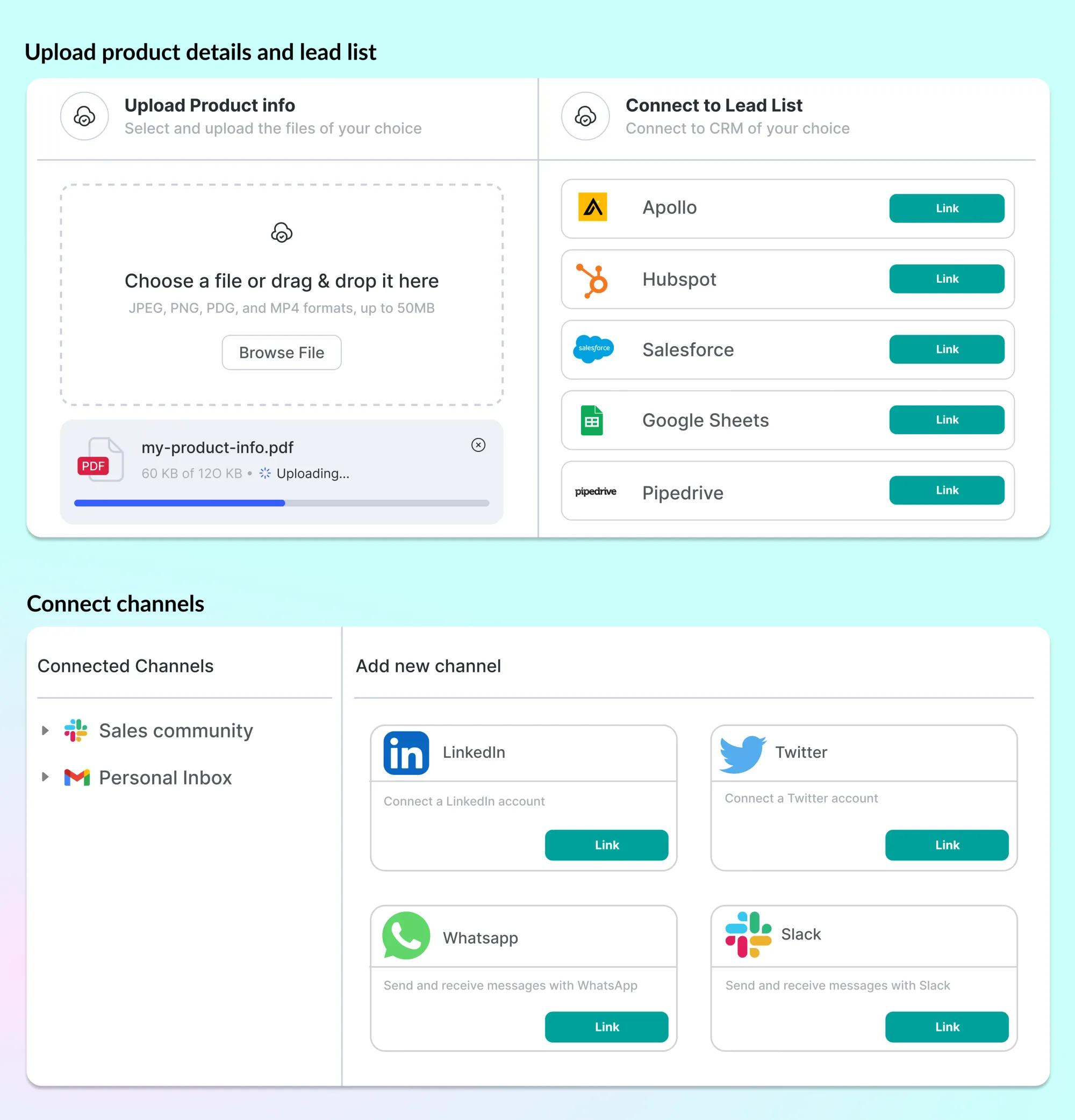 Kết nối LivingInbox với các công cụ nhắn tin, email và các cộng đồng trực tuyến mà bạn đang sử dụng, chẳng hạn như Email, Slack, Linkedin, ...