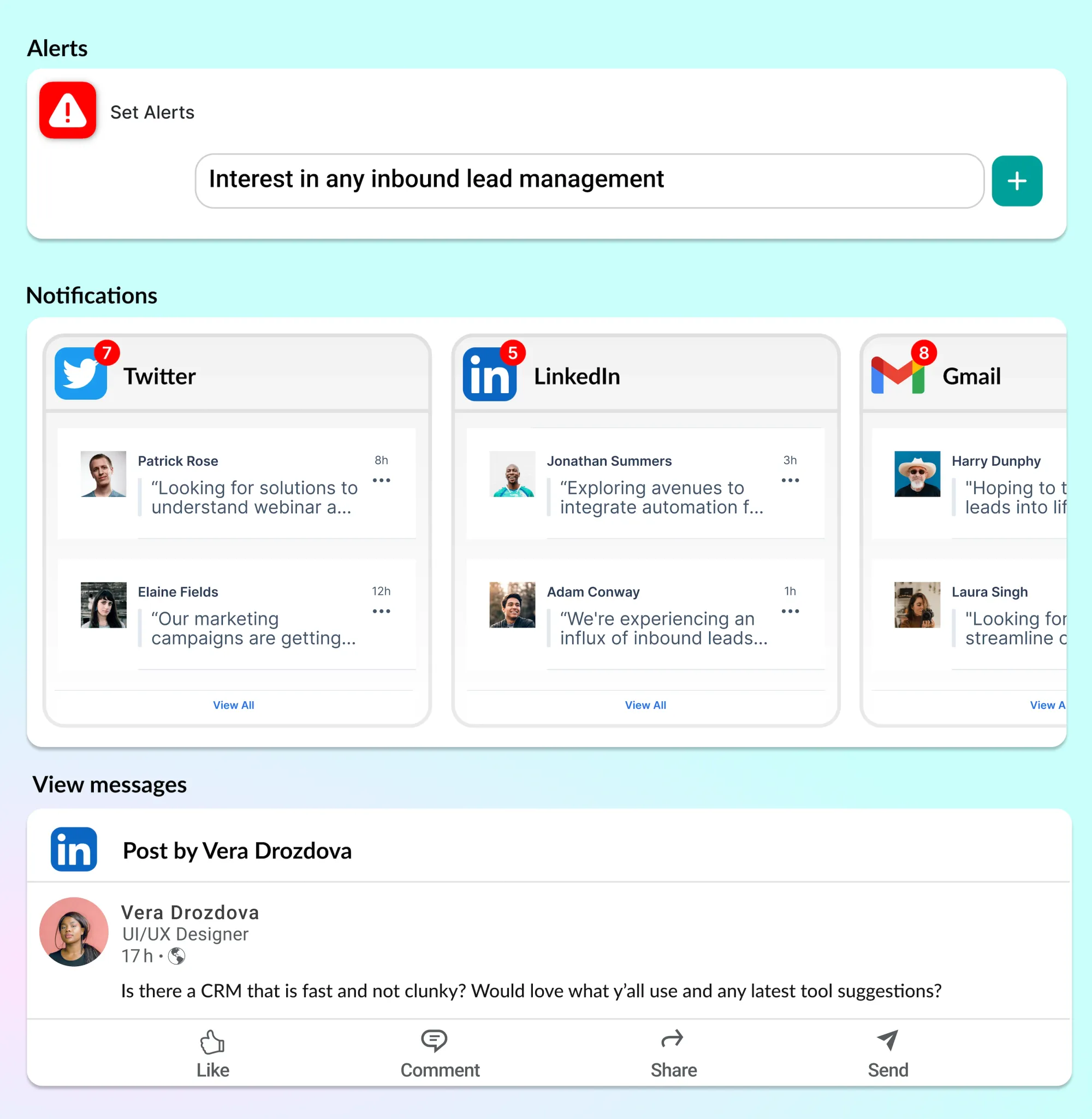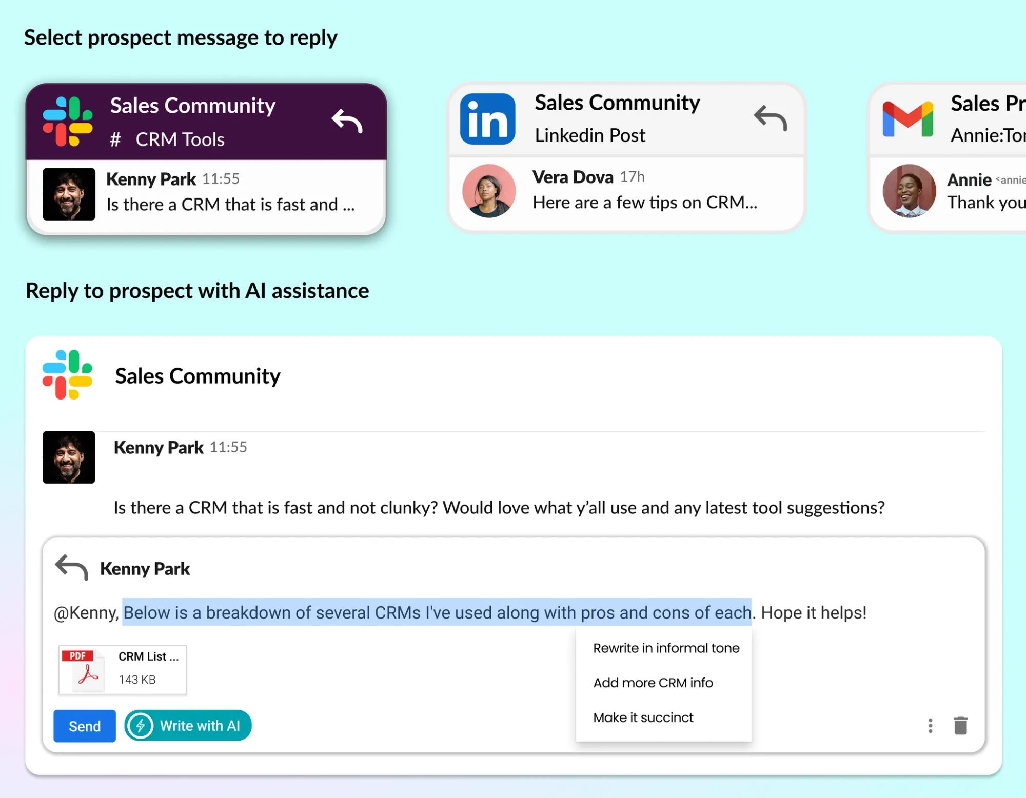 - Tổng hợp tin nhắn: Tự động thu thập các cuộc trò chuyện liên quan đến khách hàng tiềm năng từ nhiều kênh khác nhau như Email, Slack, Linkedin, ...