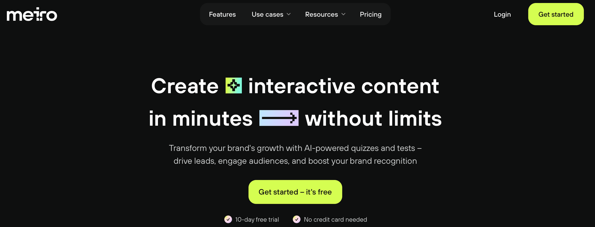Meiro là một nền tảng mạnh mẽ sử dụng trí tuệ nhân tạo (AI) để tạo ra các bài kiểm tra, câu đố và trò chơi tương tác hấp dẫn, giúp tăng cường sự tương tác với khách hàng, thu hút khách hàng tiềm năng và nâng cao nhận diện thương hiệu. Với Meiro, bạn có thể dễ dàng tạo ra các nội dung tương tác chất lượng cao chỉ trong vài phút, không cần kiến thức chuyên môn về lập trình hay thiết kế.