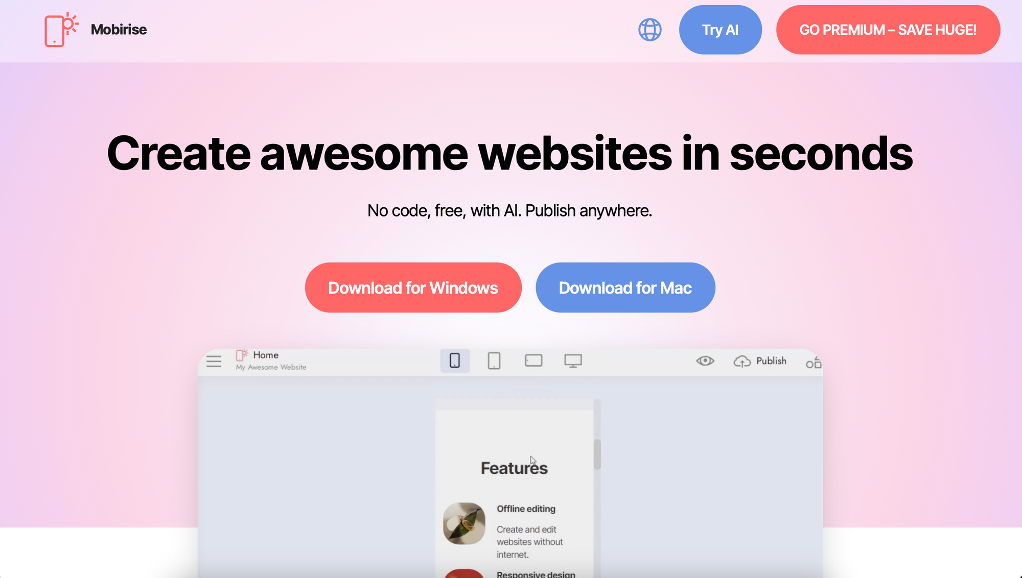 Truy cập website của Mobirise để tải phần mềm miễn phí về máy tính Windows hoặc Mac. Khám phá các tính năng tuyệt vời của Mobirise và tạo website chuyên nghiệp chỉ trong vài phút.