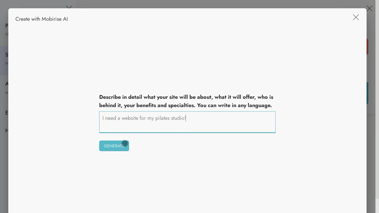 - Trí tuệ nhân tạo (AI): Chọn "Create with Mobirise Al" (Tạo với Mobirise AI) để Mobirise đề xuất bố cục trang web dựa trên mô tả ngắn về phòng tập Pilates của bạn. Nhập mô tả bao gồm các từ khóa như "Pilates", "studio", "lợi ích", "lớp học" và nhấn "Generate" (Tạo).