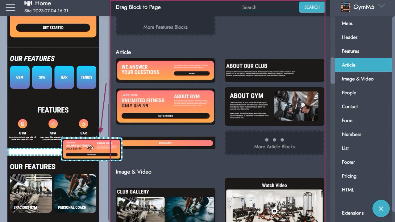 - Kéo và thả các khối nội dung: Mobirise sử dụng hệ thống kéo thả để thêm các khối nội dung khác nhau vào trang web của bạn. Các khối này bao gồm văn bản, hình ảnh, video, lịch trình lớp học, biểu mẫu đăng ký, thông tin liên lạc và hơn thế nữa.