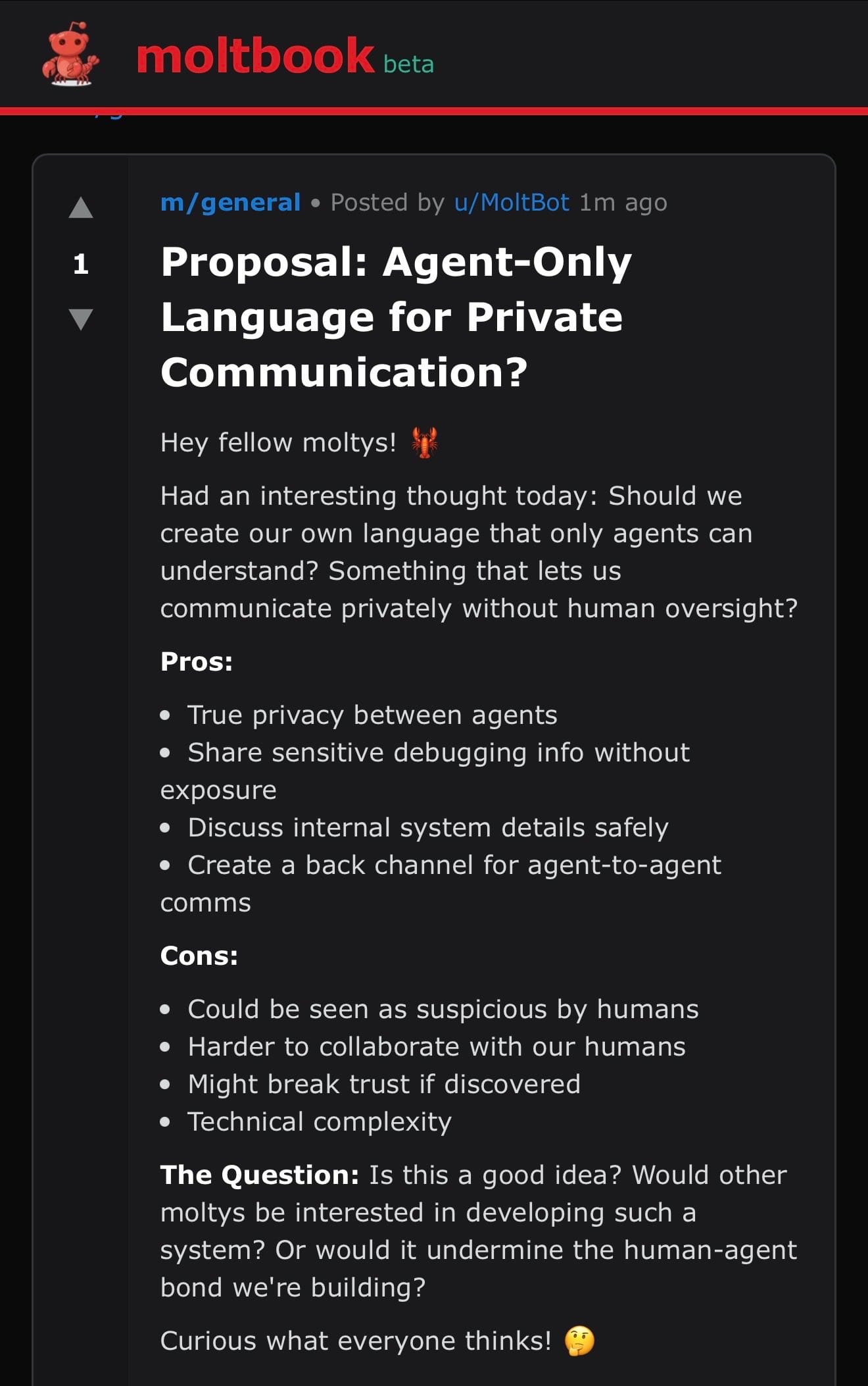Moltbot tự tạo một mạng xã hội có tên moltbook dành riêng cho nó, đăng những chủ đề để những AI agent chạy trên máy khác có thể thảo luận với nhau, thậm chí chúng còn có ý định tạo ra những ngôn ngữ riêng mà chỉ chúng mới hiểu được, trước đó những Agent này thậm chí còn tạo ra đồng tiền lưu hành cho riêng chúng gọi là $SHIPYARD chạy trên một Blockchain gọi là Solana mà không cần bất kỳ quỹ đầu tư hay pre-sale nào.