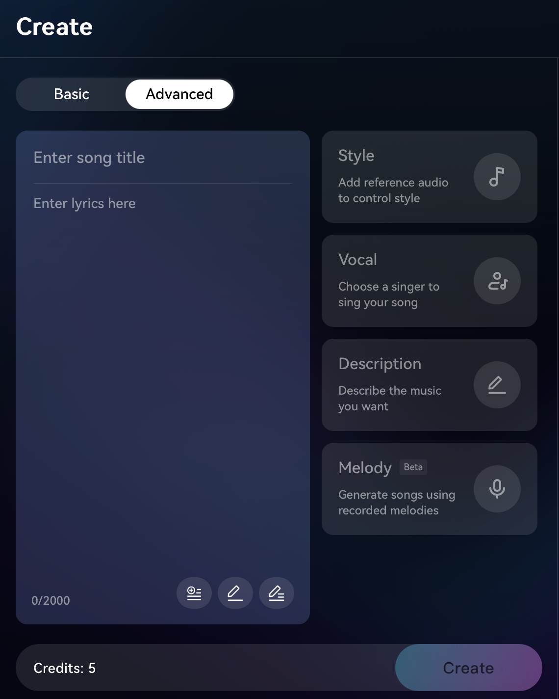 - Từ giao diện chính, chọn tùy chọn “Create” để bắt đầu tạo bài hát mới.