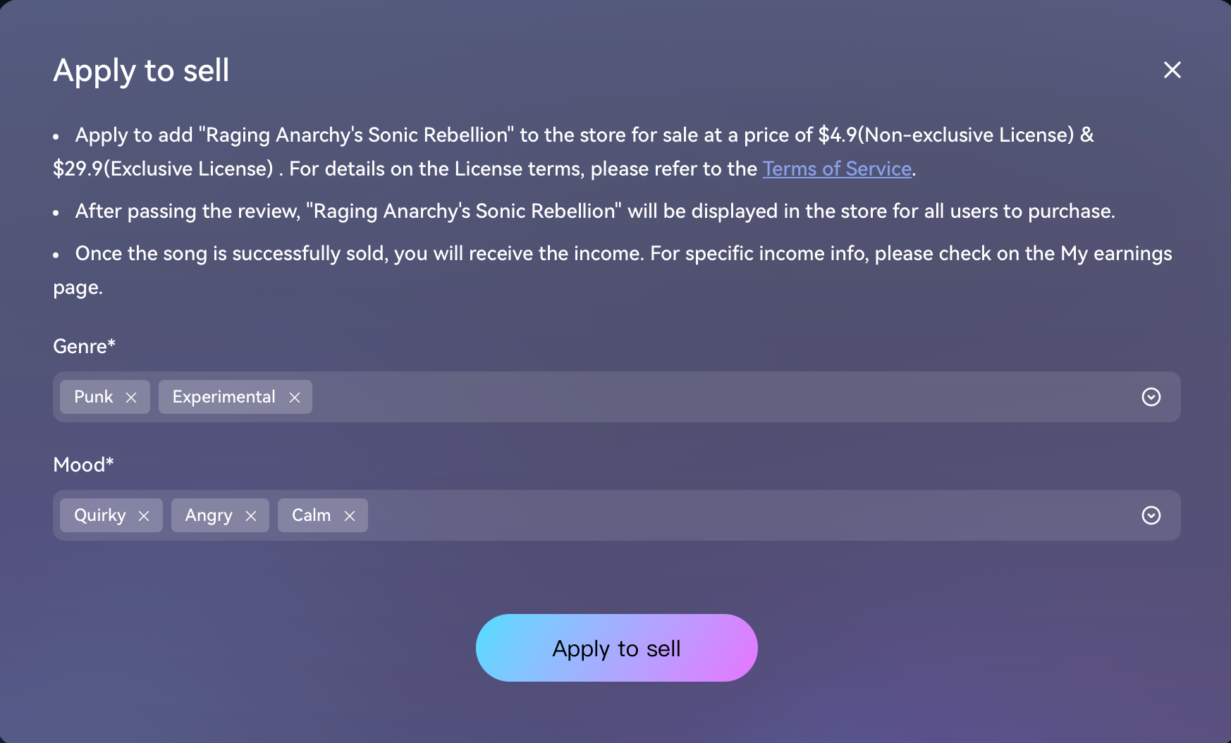 - Nếu bạn muốn bán bài hát, hãy chọn tùy chọn “Apply to sell”.