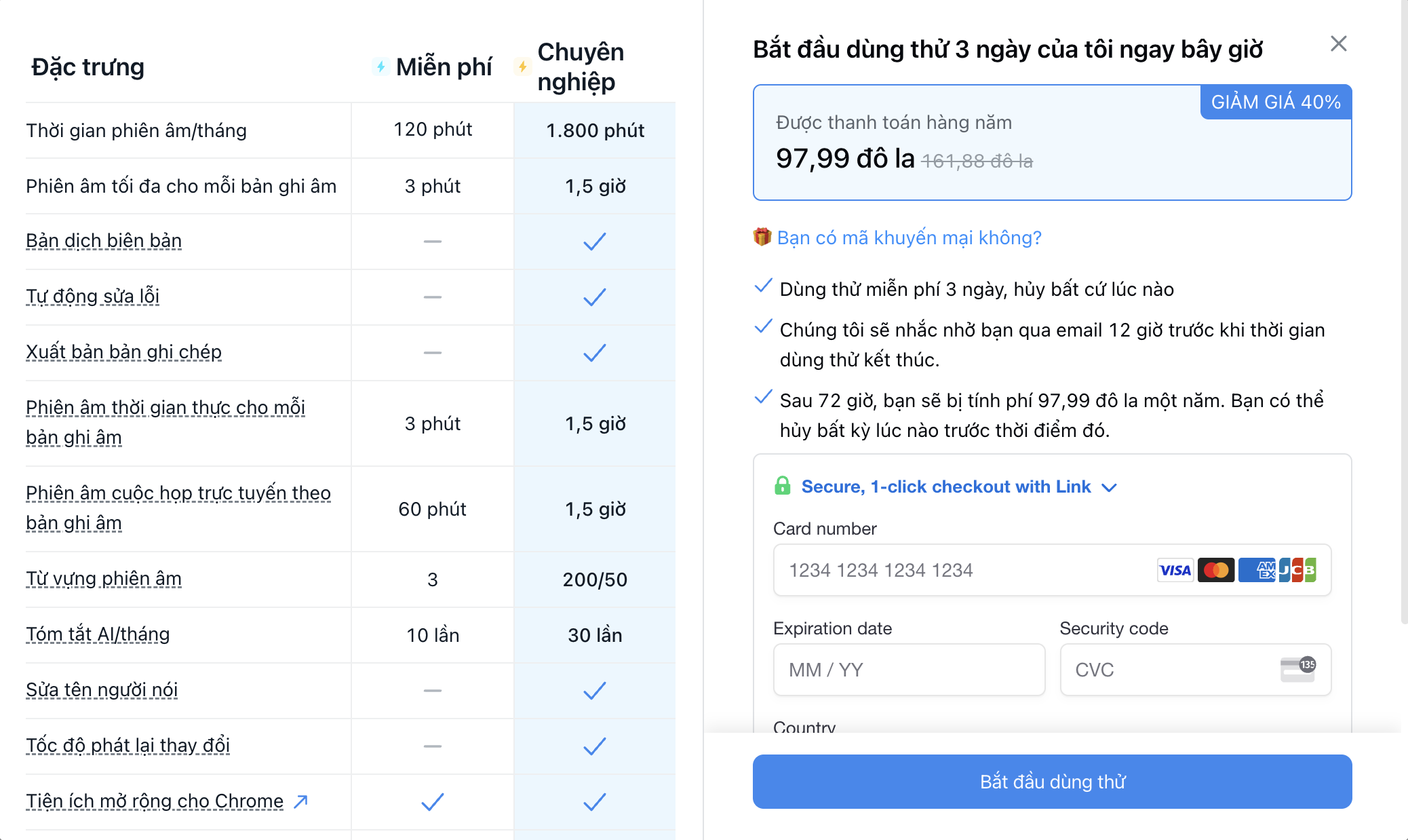 - Miễn phí cơ bản: Chuyển video thành văn bản miễn phí với 120 phút/tháng ở gói miễn phí.