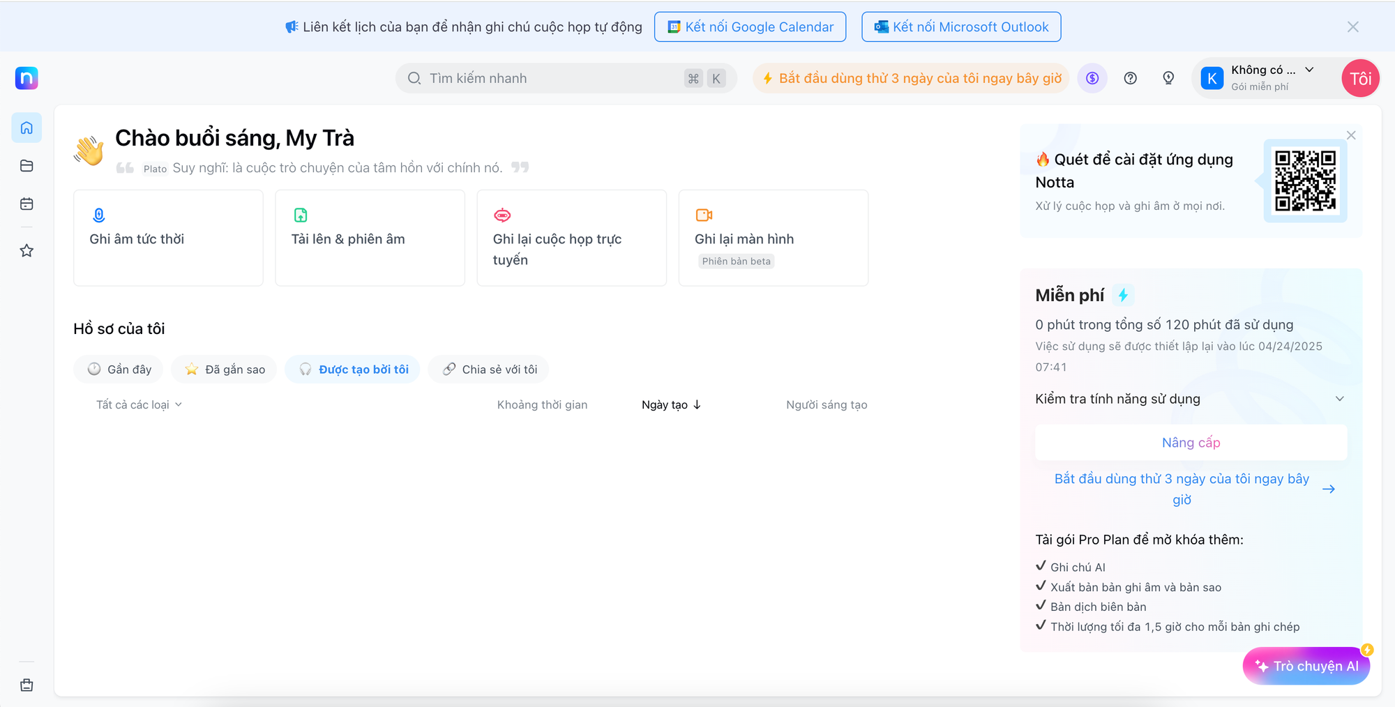 Truy cập www.notta.ai hoặc tải ứng dụng từ App Store/Google Play. Đăng nhập bằng tài khoản Google hoặc Apple. Gói miễn phí cung cấp 120 phút/tháng để bạn bắt đầu chuyển giọng nói thành văn bản online.