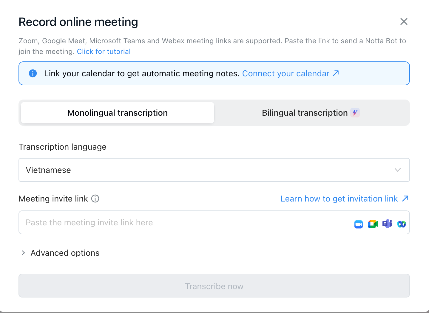 - Trong Notta.ai, chọn “Record an Online Meeting”, dán Meeting ID, rồi nhấn “Transcribe Now”. Bỏ chọn "Keep Real-time" nếu bạn không cần phải xử lý theo thời gian thực