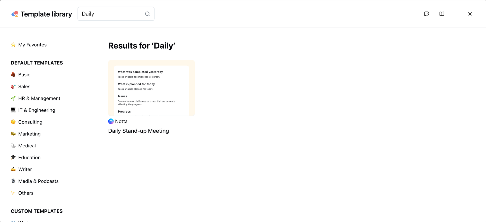- Nhấn “Template library” (bên cạnh Mindmap) > gõ “Daily Standup” hoặc “General Meeting” để AI tóm tắt: