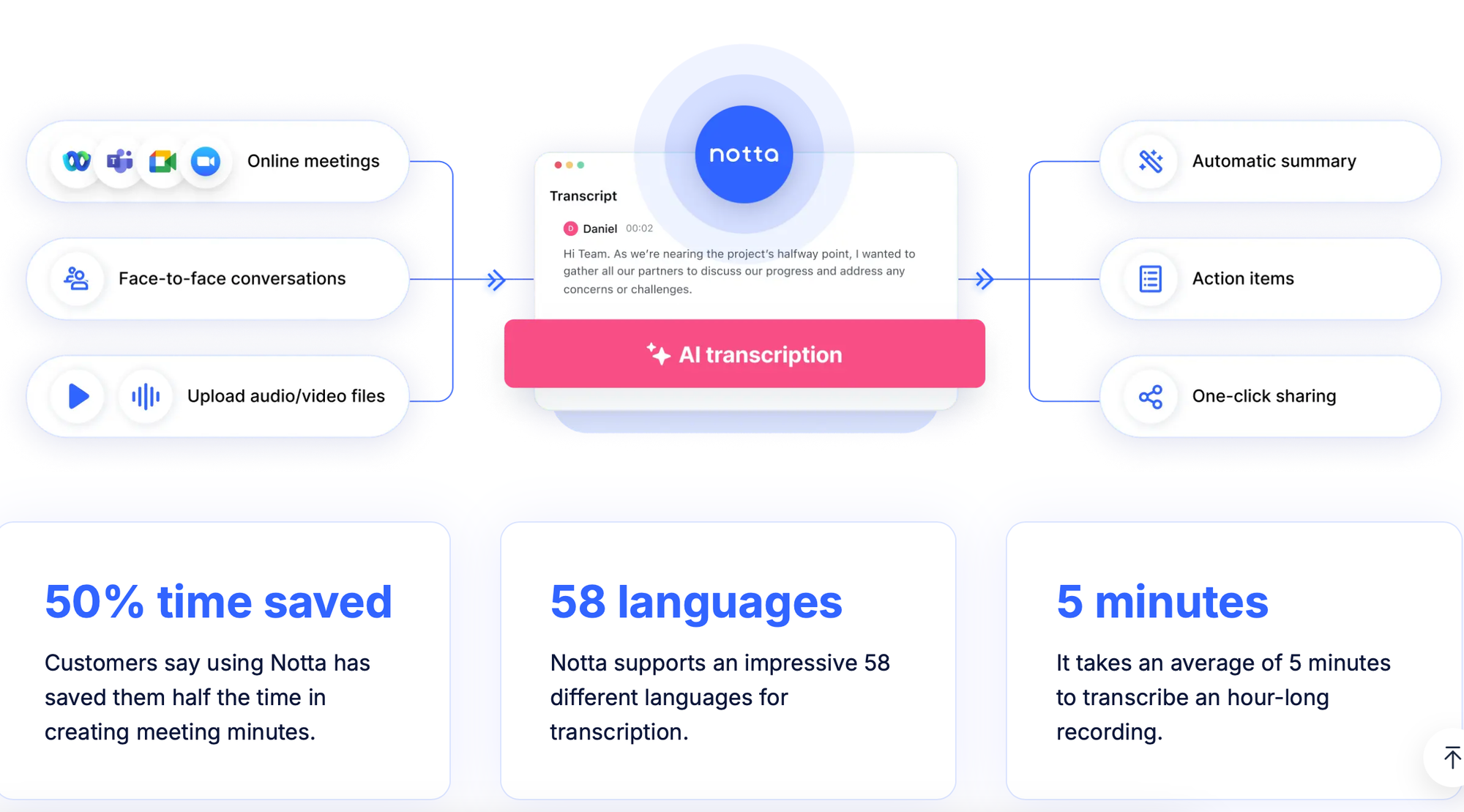 - Notta.ai tự động ghi âm và chuyển đổi âm thanh thành văn bản theo thời gian thực.
