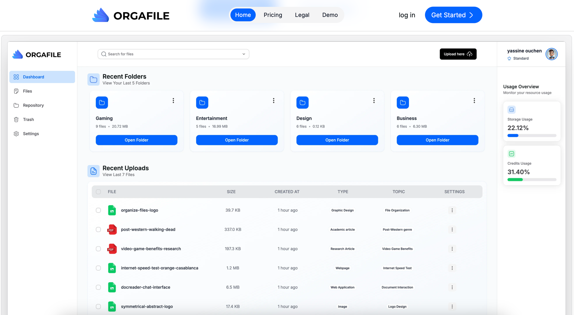 OrgaFile là một nền tảng tổ chức tập tin thông minh, sử dụng công nghệ AI để giúp bạn tự động phân loại, tìm kiếm và quản lý tài liệu chỉ trong vài giây. Dù bạn là cá nhân hay doanh nghiệp, OrgaFile sẽ giúp bạn tiết kiệm hàng giờ mỗi tháng bằng cách tự động phân loại và đổi tên các tập tin theo cách mà bạn có thể dễ dàng tìm thấy chúng khi cần.